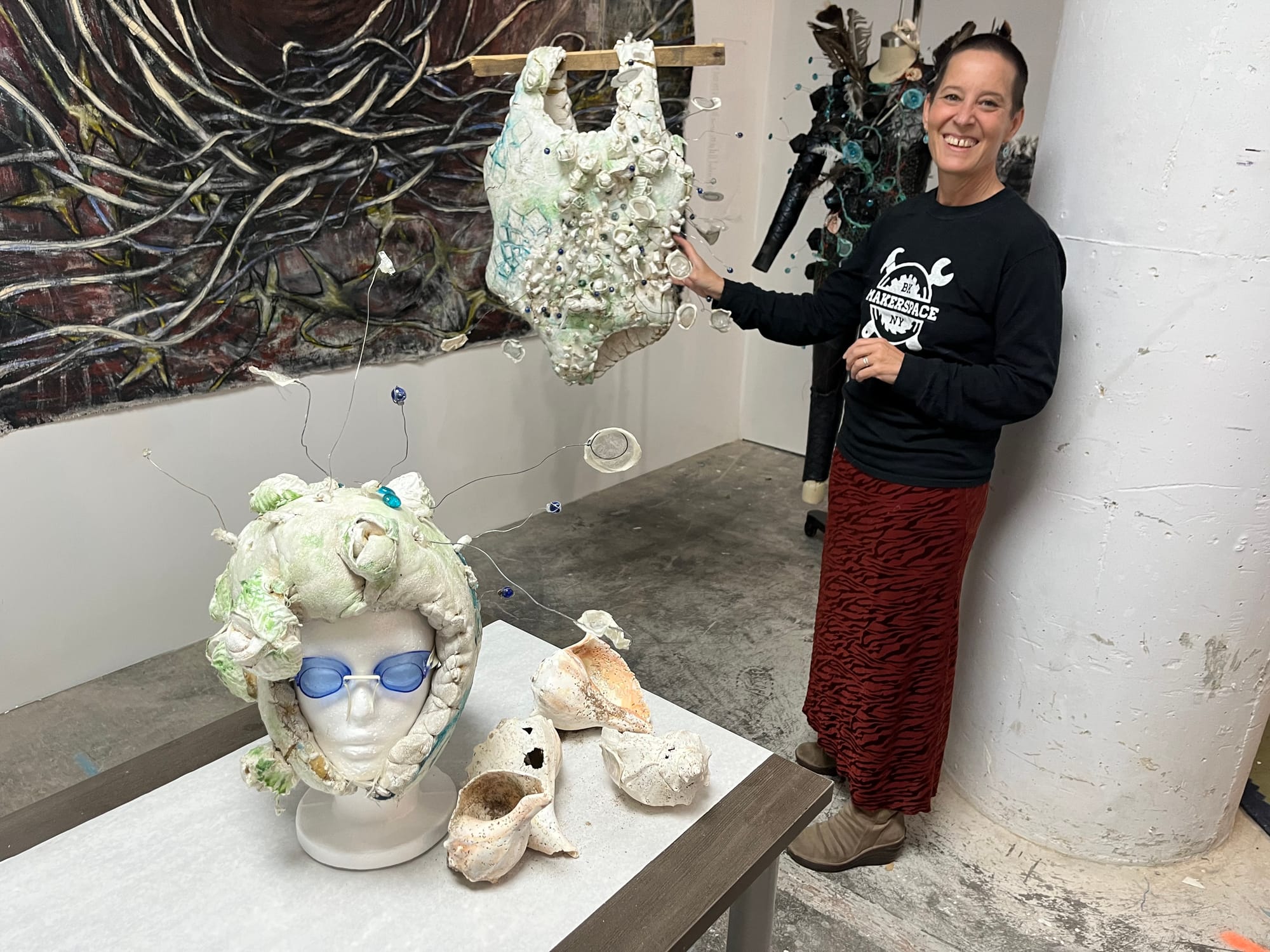 Lampman’s own studio is situated in one of two buildings MakerSpace occupies by the waterfront, where she stores several of her sculptural works that she wears on swims in the ocean. An avid open-water swimmer who recently completed a three-mile swim around Hoffman Island, Lampman likes to experiment with interfacing with her environment in new ways. “For a while, I was making these immersive environments,” Lampman says. “At some point in time, it got to the point where, instead of people reacting to being in the environment, I wanted to actually be the environment.”