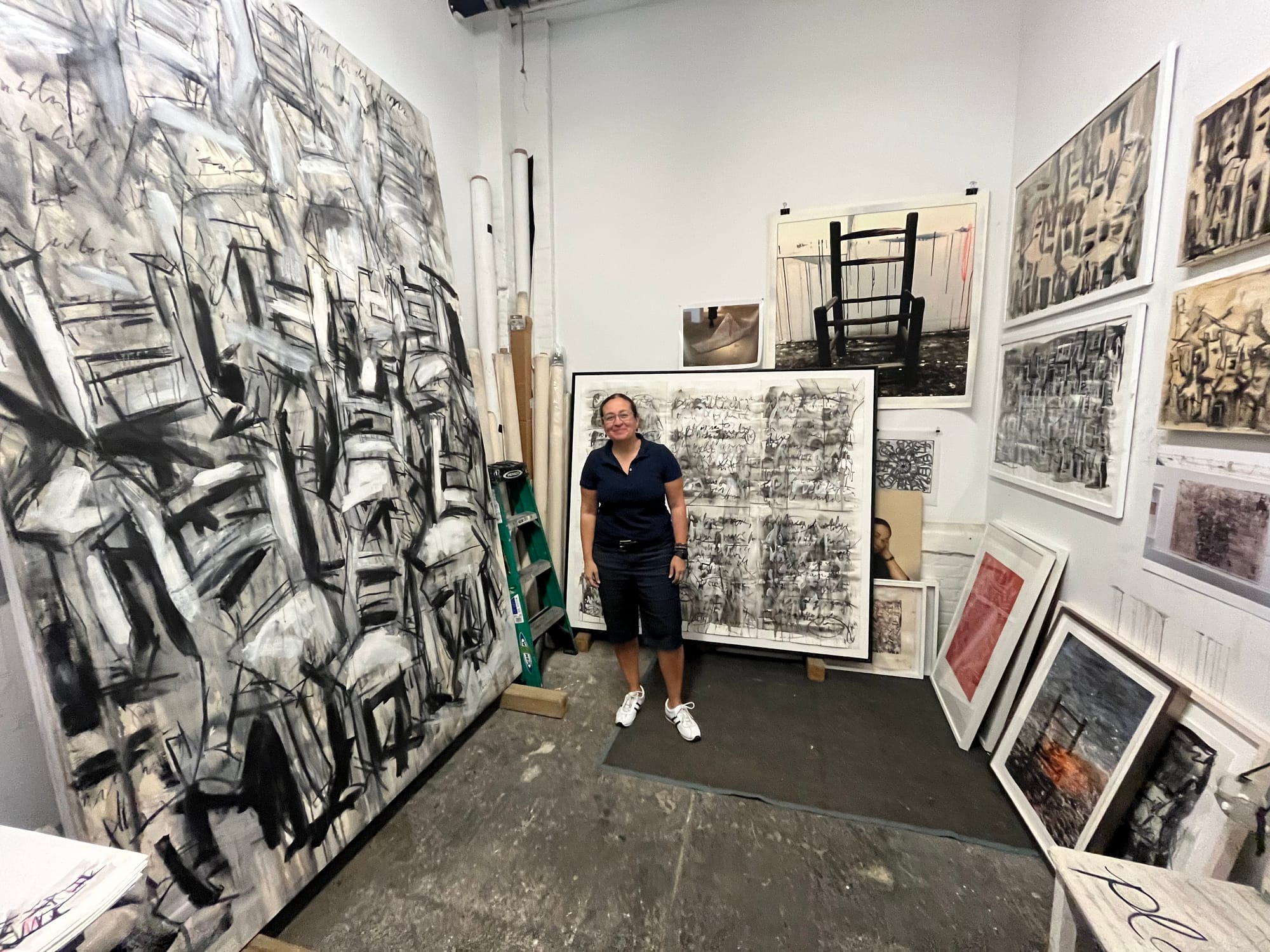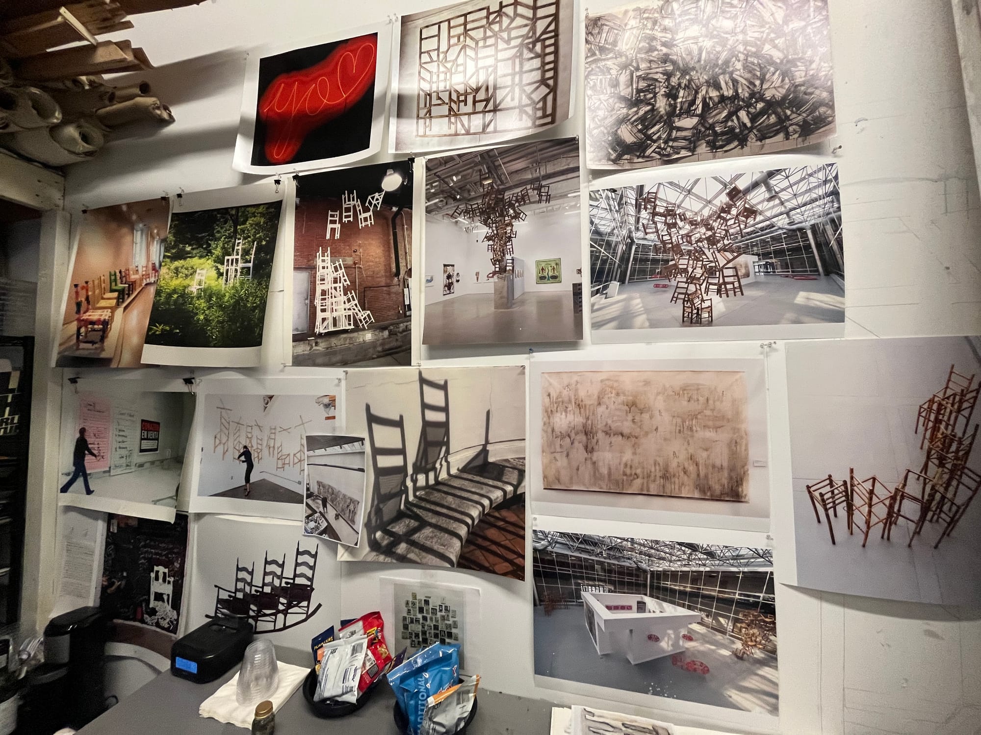 Iliana emilia garcía, who has worked in the building for six and a half years, says it’s the first time it has been included in the Wide Open event. Her studio is a narrow, closet-like space, its walls covered with pinned-up prints, framed watercolors, drawings, and two large canvases. A pretty regular scene — until I register the fact that basically everything in the room is a representation of a chair or chairs.