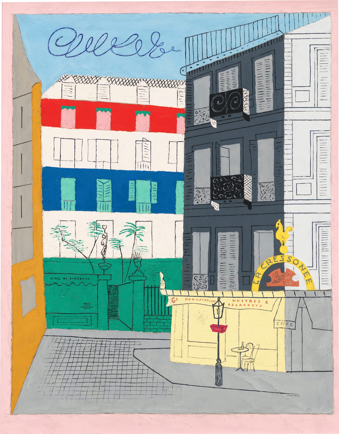 Throughout his career, Davis explored the unstable relationship between the subject and the form. He never tried to develop a fixed style, which would enable him to turn each subject into a brand (Roy Lichtenstein). When he was in Paris and did “Arch Hotel” (1929), a picture that suggests he was looking at the street outside a window that held a bottle of rum and a lemon on the sill, he was also recalling the relationship between inside and outside space that early Renaissance artists explored in their paintings of the Nativity. The stage-like setting of his Paris scenes underscores that he is a member of the audience, a viewer of the spectacle. Paris was calm and controlled compared to New York, or what Davis called the “frenetic commercial engine.” And yet, instead of feeling nostalgic for an earlier time, Davis found away to orchestrate the frenzy of everyday life in his dissonant paintings.