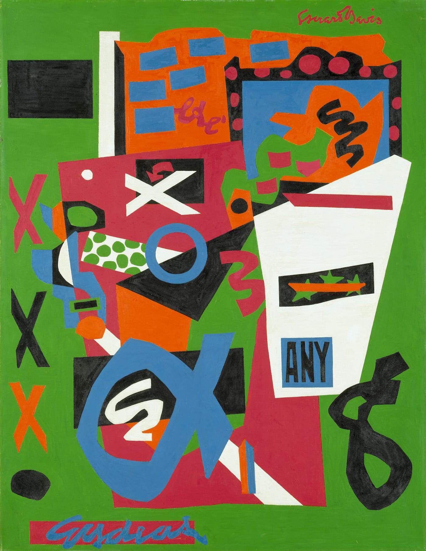 With the rise of artists desperate to align themselves with one compromised avant-garde tradition or another, it is useful to remember that Stuart Davis never fit in. Born in 1892, ten years after Edward Hopper and five years after Georgia O’Keeffe, Davis didn’t become a realist nor did he paint abstracted depictions of nature. Rather, he was the first American artist to be open to modern advertising signage and technological innovations. By 1921, while other early American modernists, such as Marsden Hartley and Hopper, were still depicting rural scenes, namely White America, Davis, who was inspired by Walt Whitman (“our one big artist”), was trying to figure out how to introduce modern life into his work. For him, modern life wasn’t about the big theme or the heroic subject; it was about everyday life and its disposable, inexpensive stuff, new technology, and pop culture: cigarettes, mouthwash, razor blades, light bulbs, radio tubes, gasoline pumps, egg beaters, jazz and popular music.