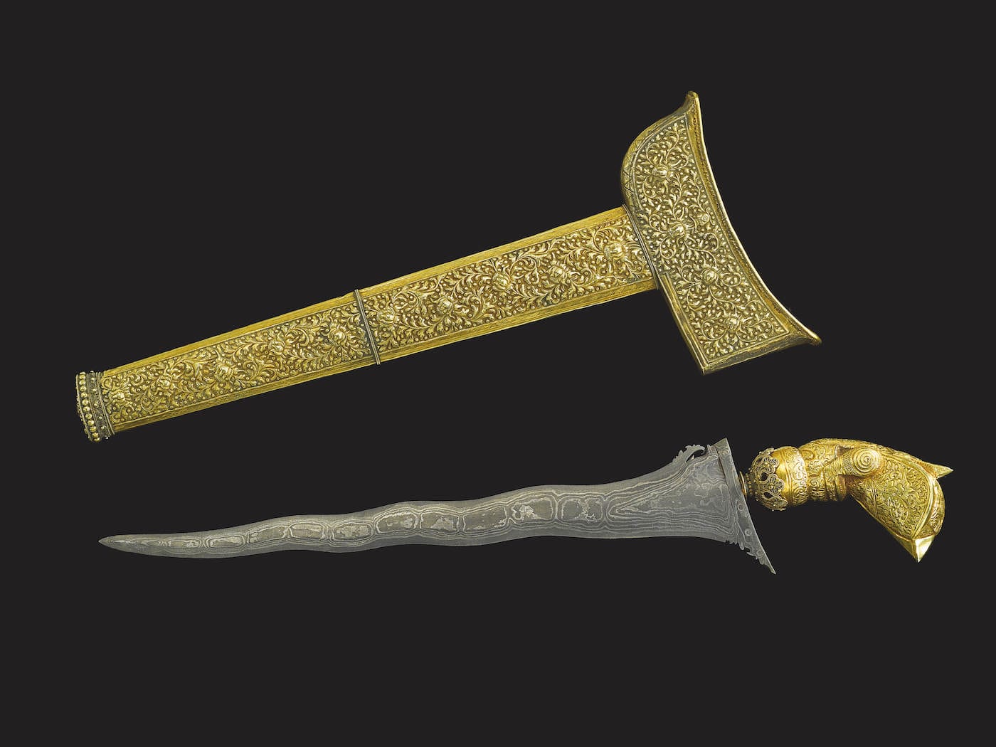 Gold also dominates the interior confines of President Donald Trump’s infamously gilded Manhattan penthouse residence on Fifth Avenue. And according to The Midas Touch‘s catalogue of fineries, it looks like Sotheby’s is taking many of its visual cues from the reality star’s asinine aesthetic. Gold chairs? Duh. Gilded books? Double duh. Golden jewelry? How dare you ask. Daggers? Why yes, there are two for sale.
