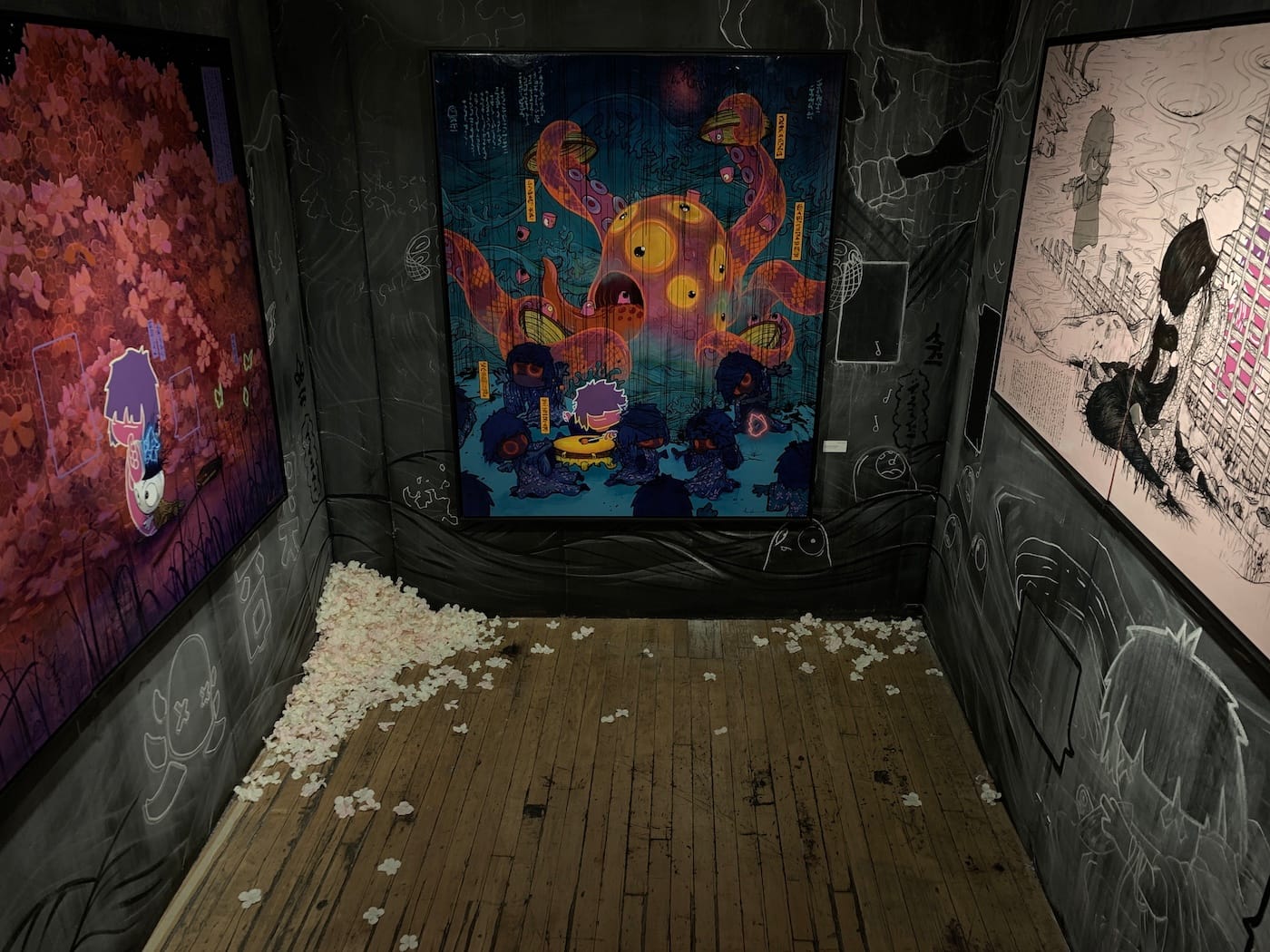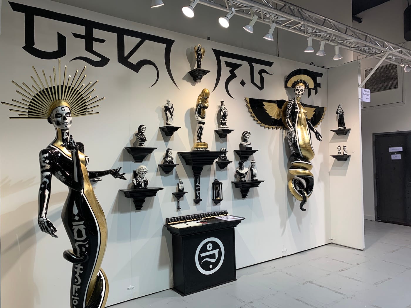 One doesn’t necessarily expect to see figurative painting at a fair devoted to urban art, and that’s one of the many reasons why Evoca1’s large oil paintings initially stood out to me. The Dominican-born figurative artist, whose real name is Elio Mercado, has become a prominent figure in Miami’s street art community. His work brings together vivid imagery with urban spaces, bringing expressive and brooding compositions like “Girl With Flag” into public view.