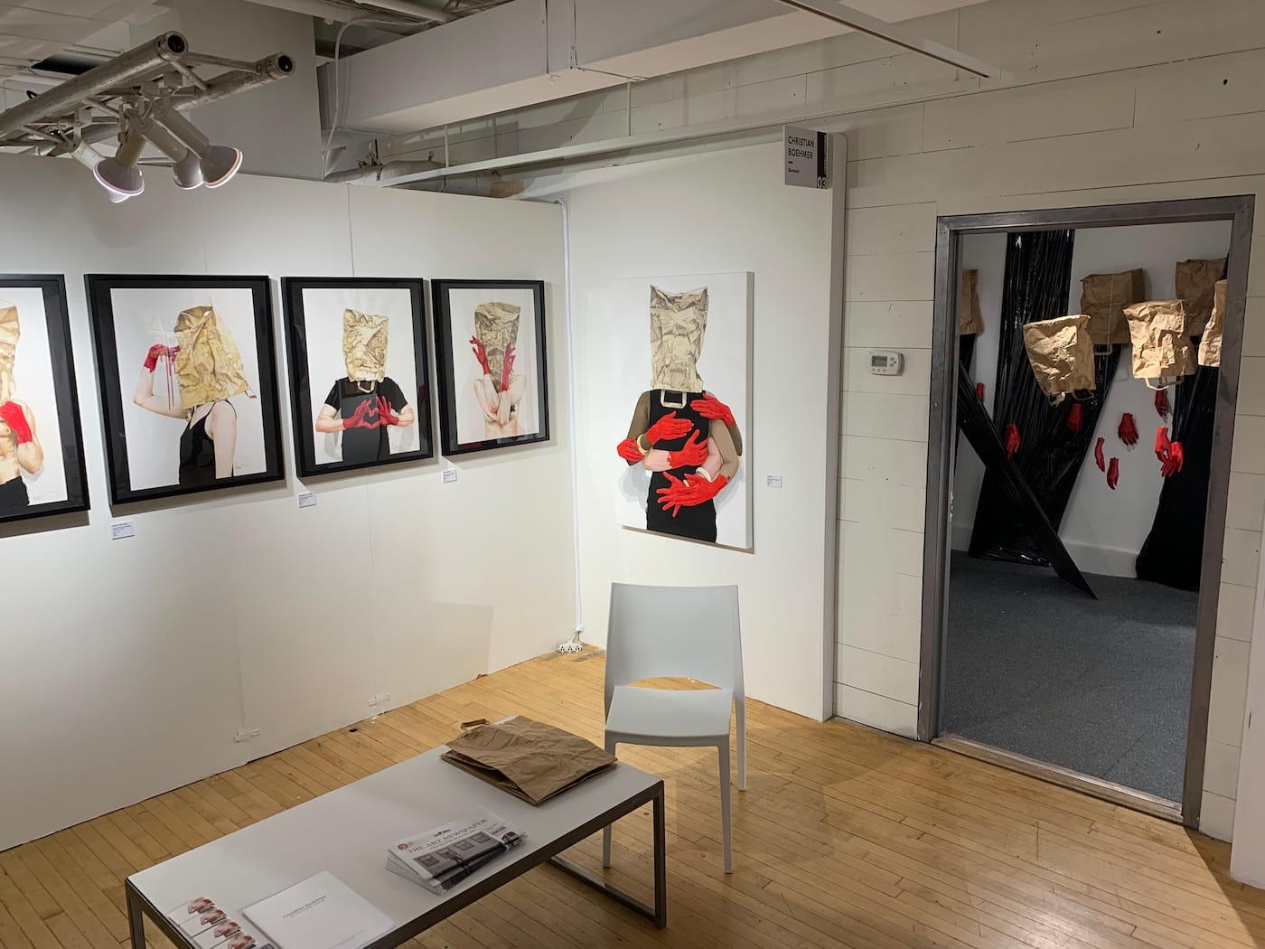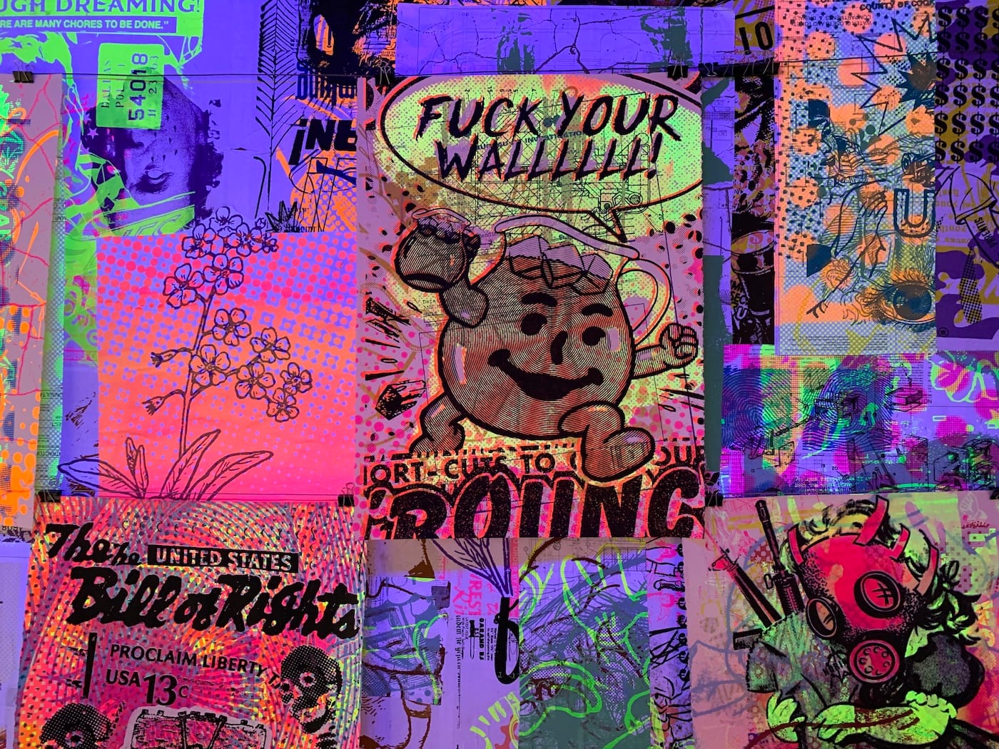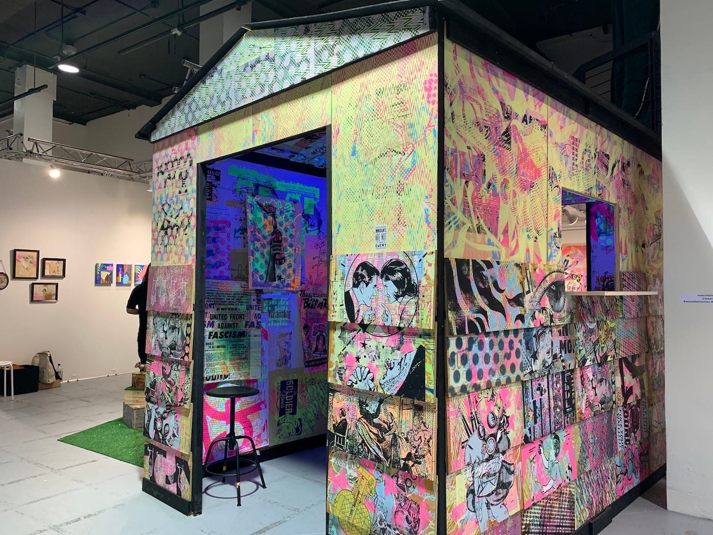 One of the most experiential exhibits at Moniker is the five-artist group from America and the United Kingdom called Fatherless, which has created a shed full of neon-colored, anti-fascist monoprints. The group describes their aesthetic as “a visual mix-tape of shenagination” that aims to capture and recontextualize contemporary life. Combining pop culture with graphic design, the works manage to be as funny as they are politically poignant.