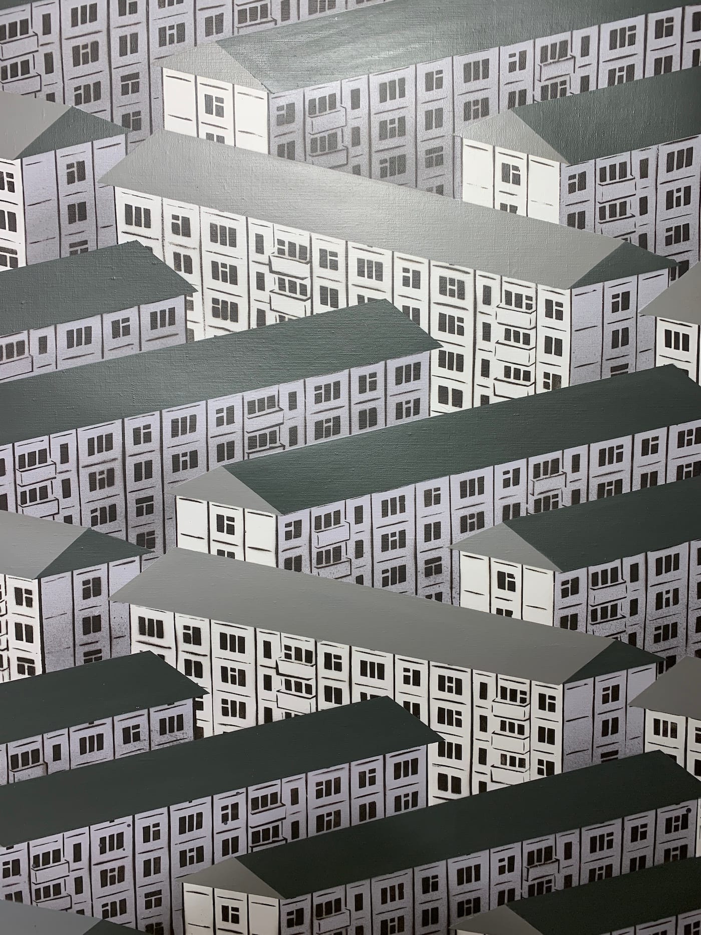The Russian artist Slava Ptrk is a journalist by training, and as such his art circles around social and political realities. “One of my main tools is irony,” he writes on his website. “I try to speak ironically about absurdity that is happening right now, over the absurdity of the surrounding reality.” Accordingly, his “View from the Window” is an orthographic take on the homogeneity of urban developments. Greyscale and drab, this image appears to lampoon the sameness of Soviet architecture.