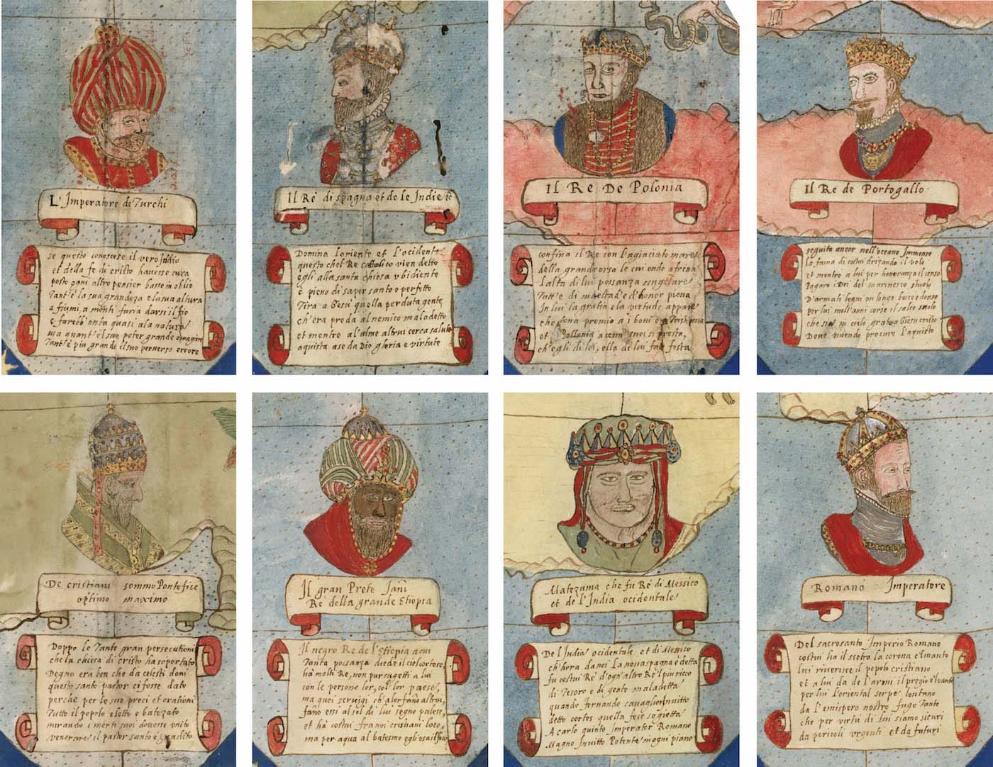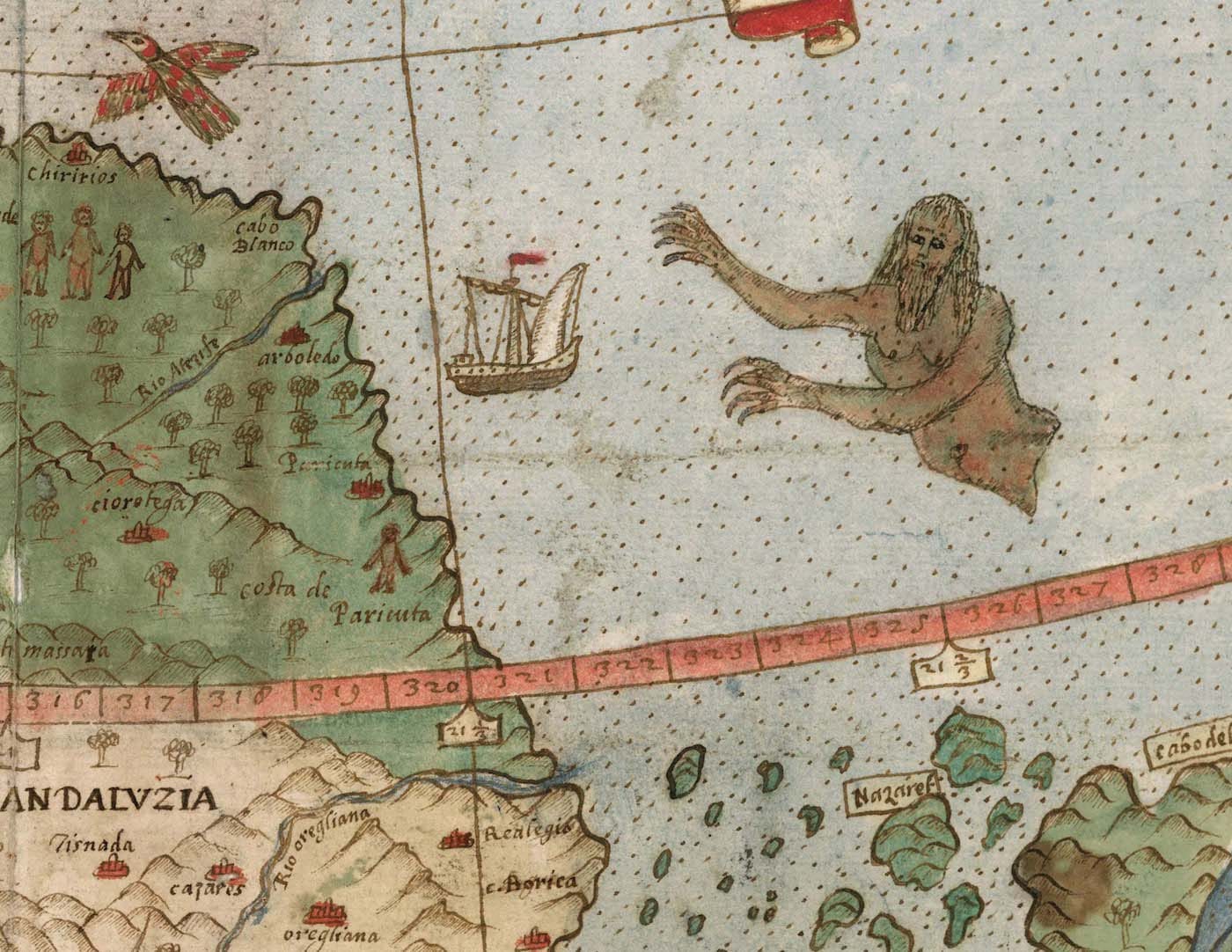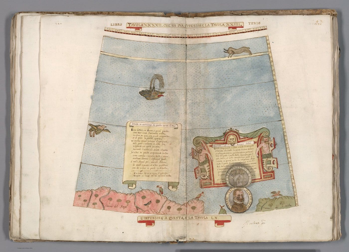 Monte’s map stands out for this uncommon choice of perspective, but like many Renaissance-era maps, it is eye-catching for its illustrations that fill nearly every blank space. The relationship between land masses and waters is fairly accurate, considering the map’s time period, but its maker also includes many fantastical beasts that frolic on land and sea, from reptilian beasts to griffins to unicorns. Other pictures are more faithful to reality, such as portraits of Monte himself and of King Philip II of Spain — the latter of which reminds of the Spanish empire’s power during that time.