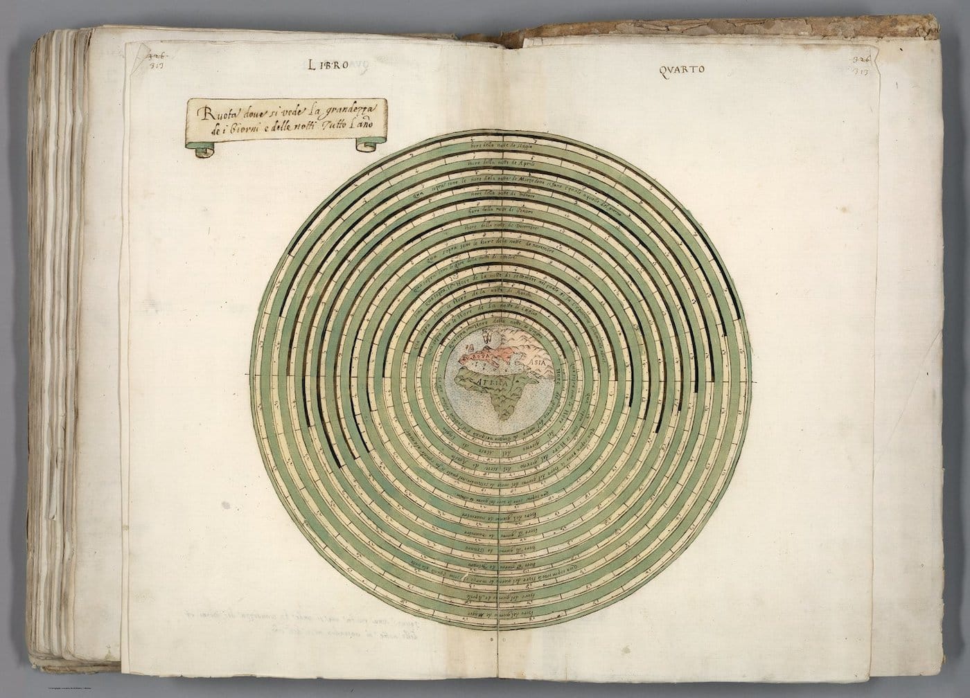 Urbano Monte, born in 1544, was a wealthy scholar from Milan who dedicated much of his later life to studying the earth’s geographies. In addition to publishing a voluminous treatise detailing our planet’s physical complexities, the nobleman also designed three planispheres that laid out the wonders of the world in rich, colorful illustrations. His first, completed in 1587, represents the largest known, early modern map of Earth, and includes scientific information such as regional climates and lengths of days. Spanning over nine feet in diameter, it is made up of 60 sheets that capture our continents and waters in stunning, handdrawn detail.