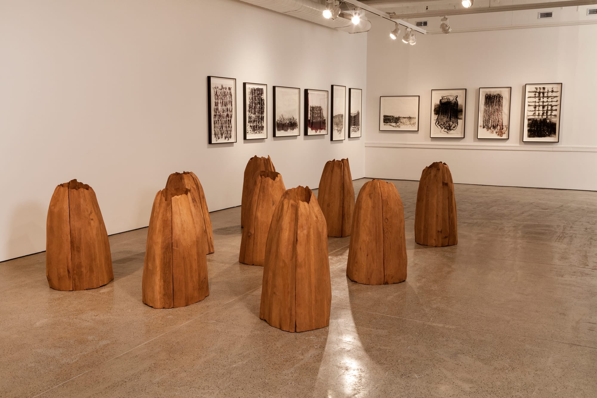 “Zakopane” (1987) will draw your eye into the depths of the museum’s space. It bears resemblance to what I imagine a wall would look like after a firing squad had its way. The details here are unsettling: dozens of bullet-shaped holes in the upright cedar planks; cantilevered beams one could hang a noose from; and more than a dozen gored cylindrical buckets below. What is haunting Von Rydingsvard’s work? What is haunting Von Rydingsvard?