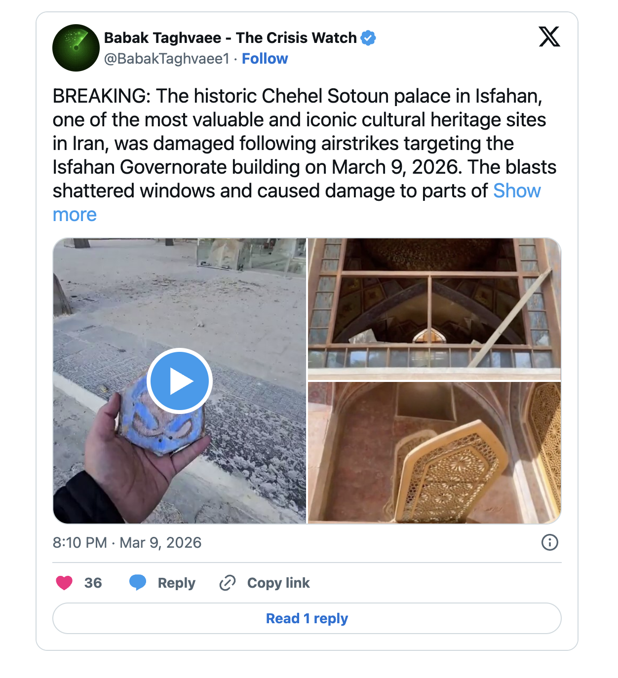 Iranian news outlet WANA Agency reported that various elements of the 17th-century Chehel Sotoun palace were damaged amid strikes on the adjacent provincial government building near the city's central public square on Monday, March 10. Initial videos indicate that while the structure of the palace itself appears intact, the blasts have shattered the glass windows, the intricate khatam inlays vividly decorating the walls and honeycomb-esque vaulted muqarnas ceiling, and cracked several Persian miniature-style murals.