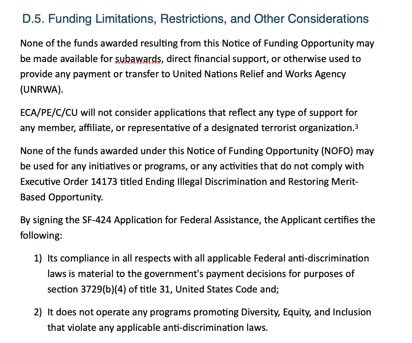 Strangely, an additional point to the limitations and restrictions section specifically outlines that “none of the funds awarded resulting from this ... opportunity may be made available for subawards, direct financial support, or otherwise used to provide any payment or transfer to United Nations Relief and Works Agency (UNRWA).”