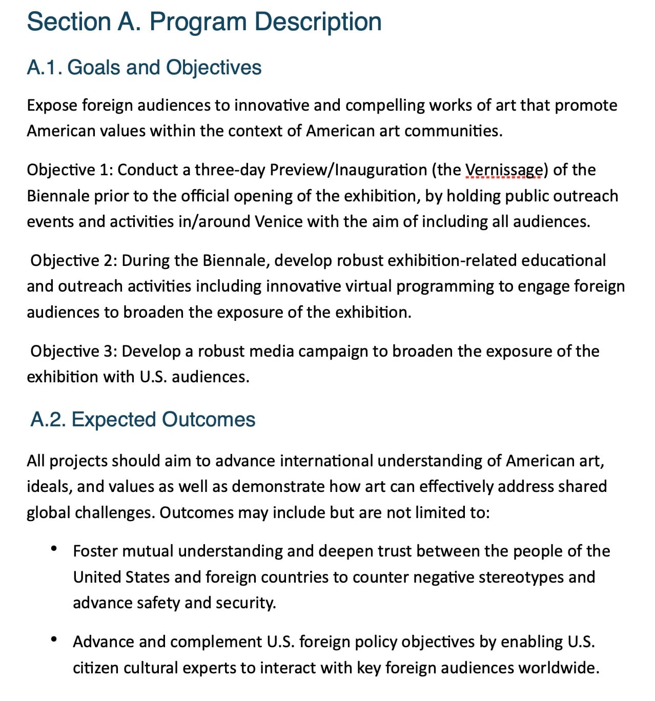 In addition to the shortened timeline, collaborating artists and curators are now expected to outline how their program ideas “will work to advance the interests of the United States in program administration, design, and implementation.” The proposal review criteria will evaluate an artist’s “ability to showcase American exceptionalism and innovation.”