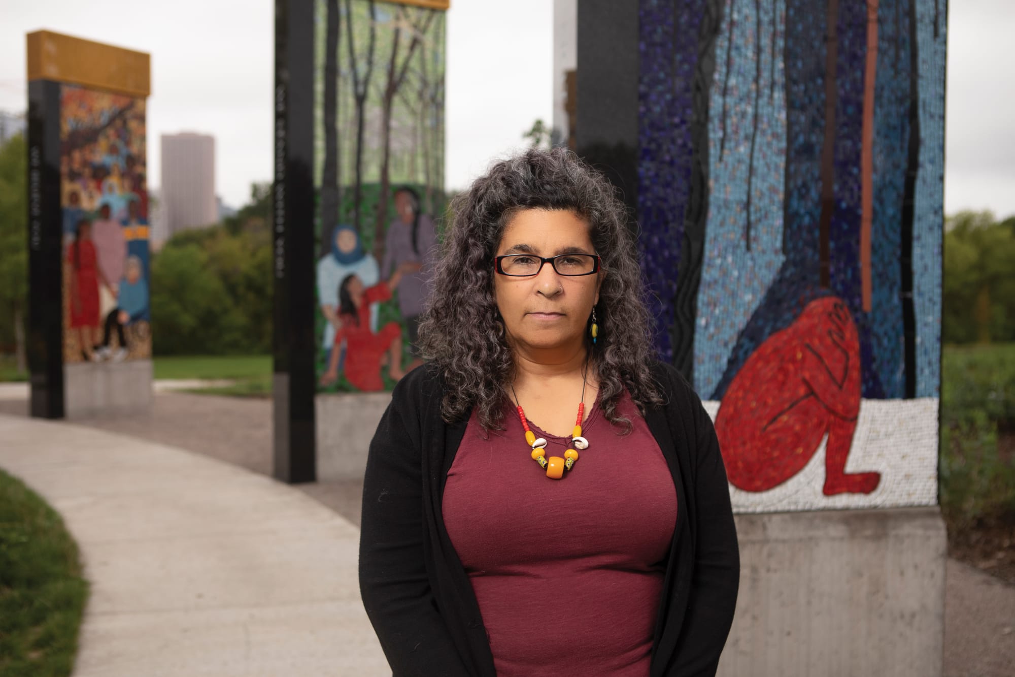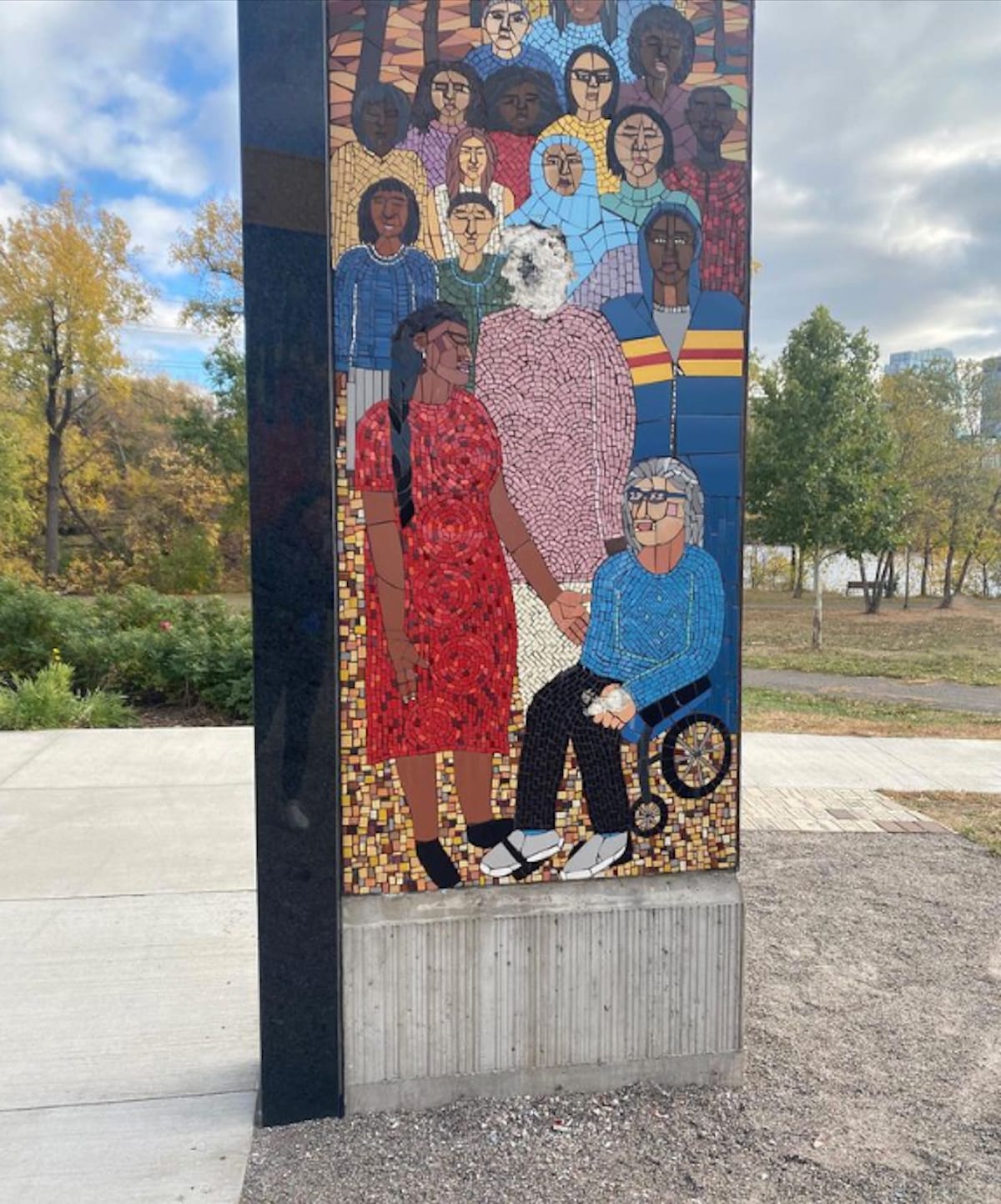 The Memorial to Survivors of Sexual Violence at Boom Island Park, created by Black and Indigenous artist Lori Greene, is the first permanent memorial to rape survivors in the United States. On three concrete columns beside the Mississippi River, five colorful mosaic panels reference the experiences of non-White, LGBTQ+, and disabled victims.