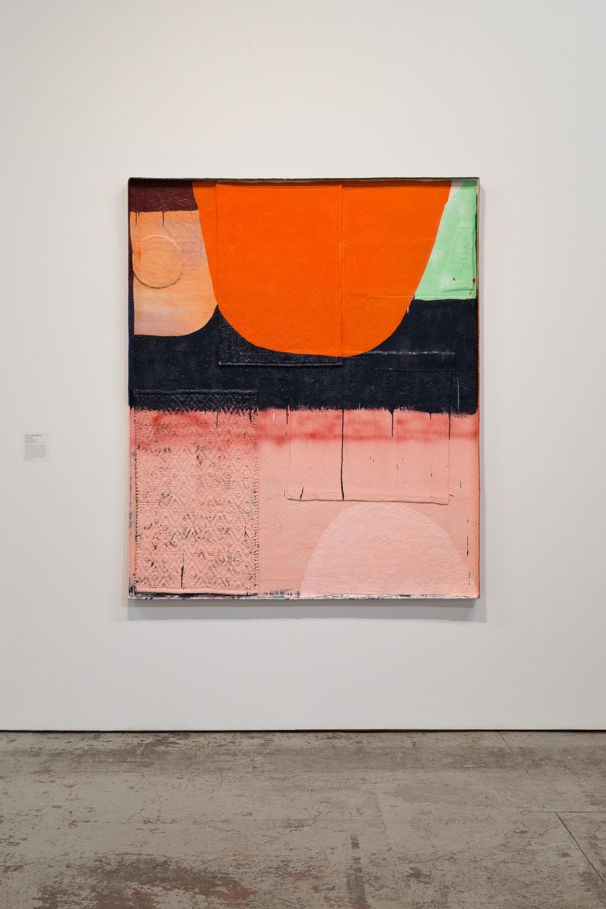 Southeast Michigan is a place structurally and culturally shaped by its historically broad manufacturing base, and which in turn defined itself through its material output. A desire to reconcile with this past is suggested in the attention to material that suffuses so many of the exhibited works. In the paintings of James Benjamin Franklin, the everyday material environment of the artist fuses with his work. In the piece titled “Dreams and Demons” (2019), a rug, a jute trivet, some towels, and other scraps of fabric populate the picture plane, encrusted beneath a painted field of bright, inorganic hues. The overall look exudes an improvised bricolage aesthetic.