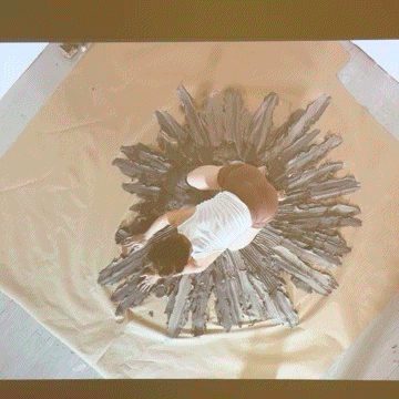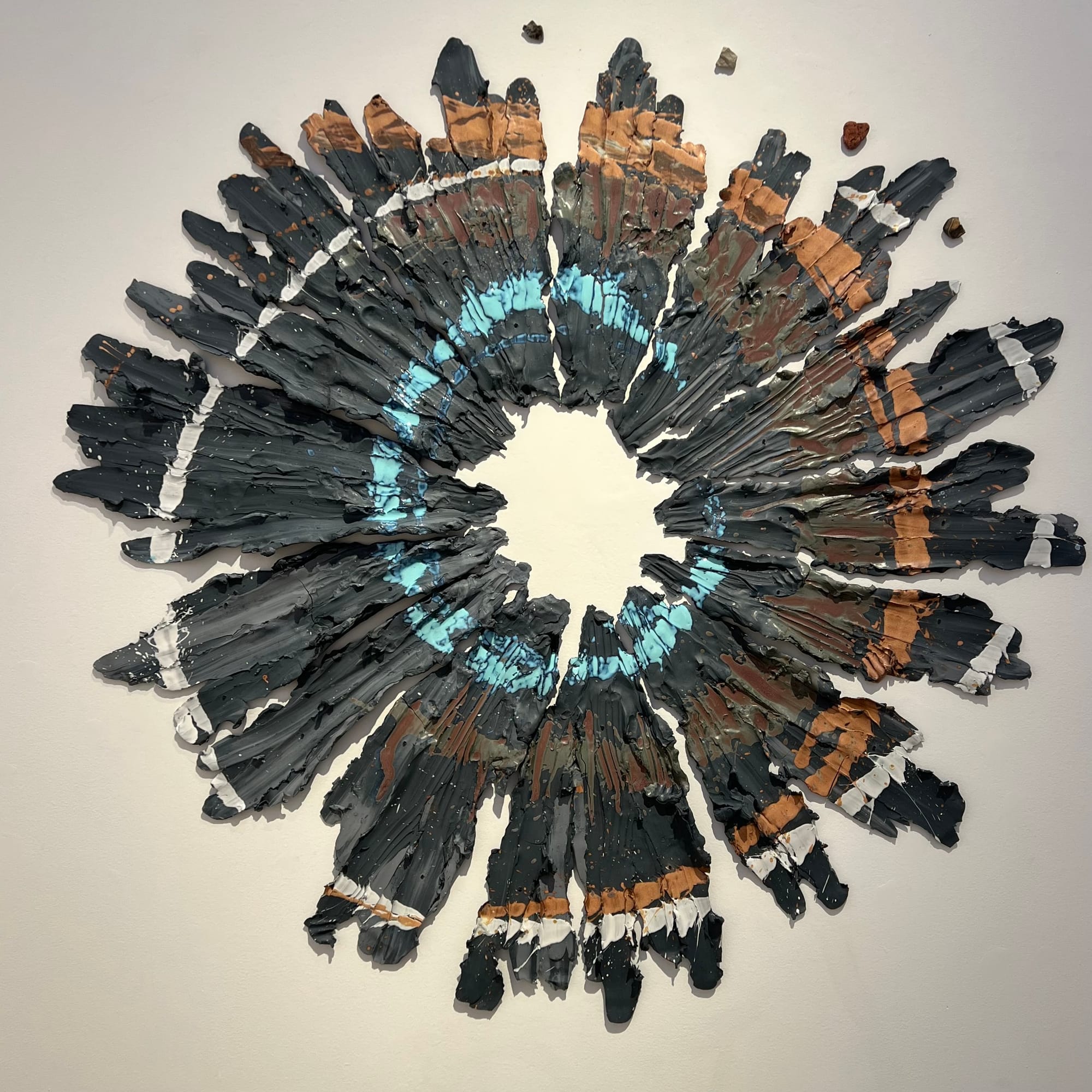 The exit wound is created by Brie Ruais's body, which is shown in the video "Digging in, Digging Out", (2021) on view in the Albertz Benda gallery, as well as online on Vimeo. Her process involves pushing clay out from a center where she sits on the ground. She tears, scraps, spreads, to form ray-like forms with luscious textures and a blend of colors. Once this spreading is finished, she cuts the work into pieces and then fires them in a kiln. Her encounter with Vuong's poem elucidated her attraction towards leaving a rough hole at the center to evoke a puncture.