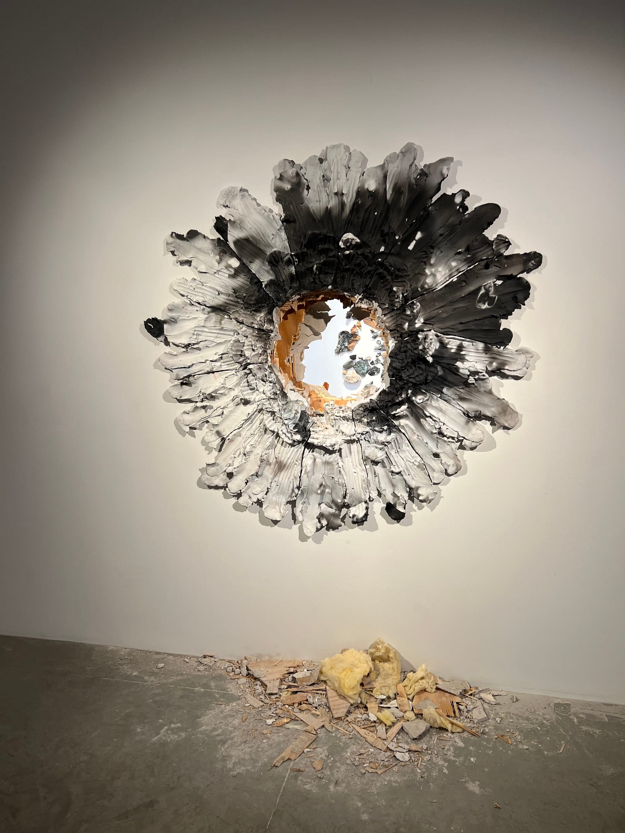 As installed at the Albertz Benda gallery, "Letting the Fire In, 130 Pounds" features a literal exit wound ripped through the gallery wall. Its shards sit in a pile underneath the piece. It is possible to peer through the hole to see other parts of the show.