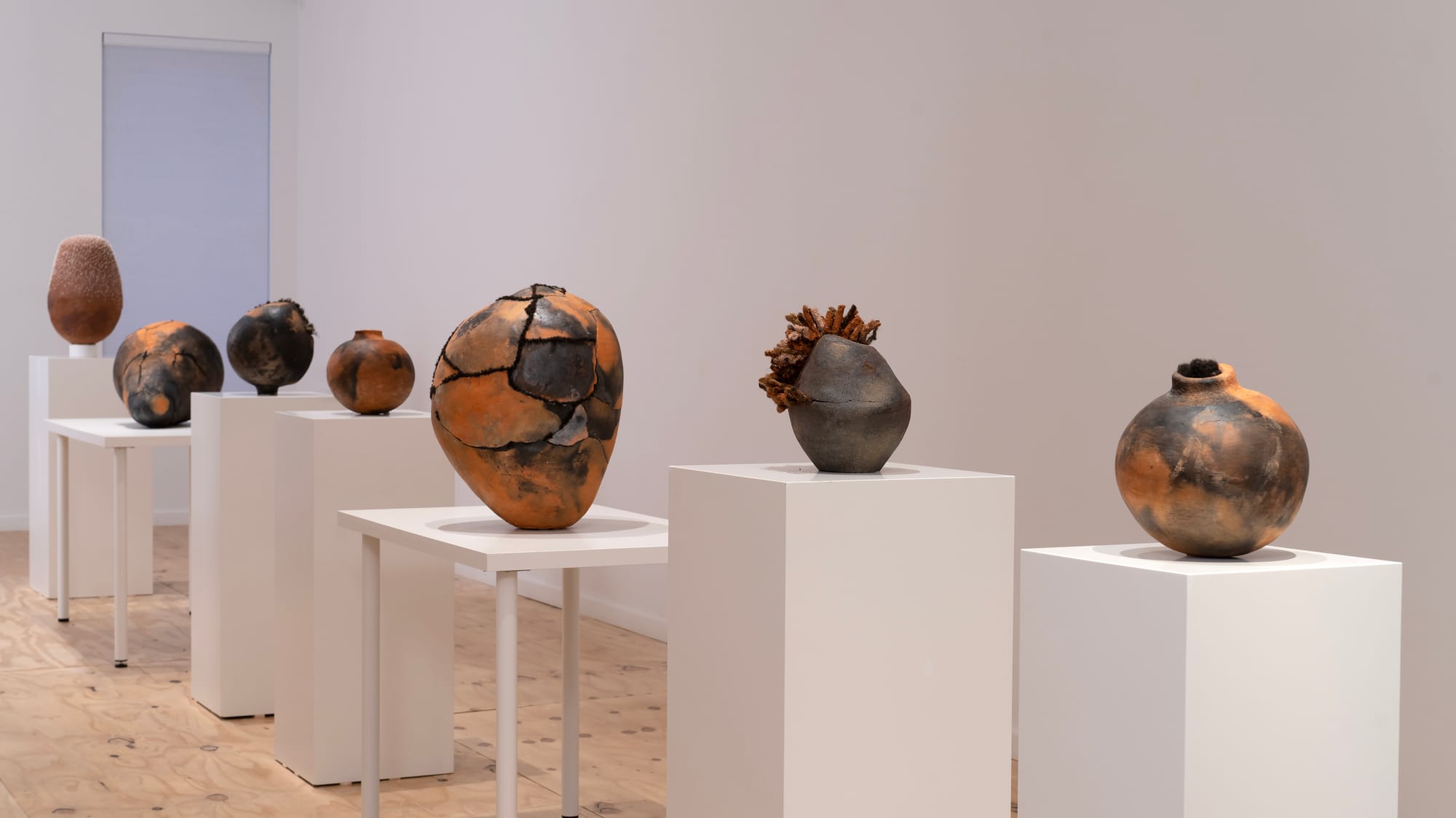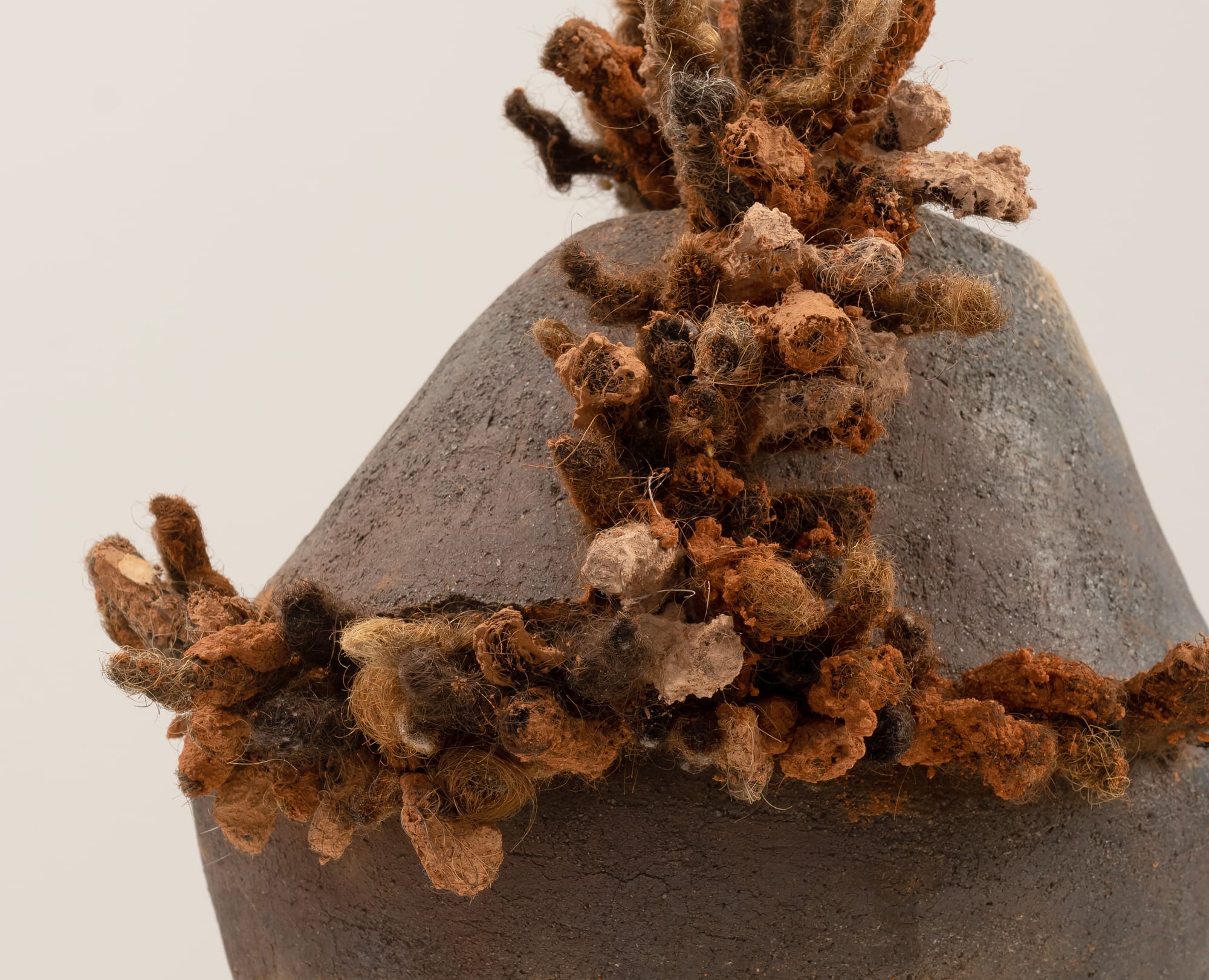 On the second floor, Gbadebo presents a series of pit-fired clay vessels filled or studded with Carolina gold rice grains or samples of Black hair, titled with text from headstones and grave markers in the True Blue cemetery. Gbadebo made the clay using the soil she collected from the cemetery, but was initially paralyzed with freedom when it came down to actually sculpting it.