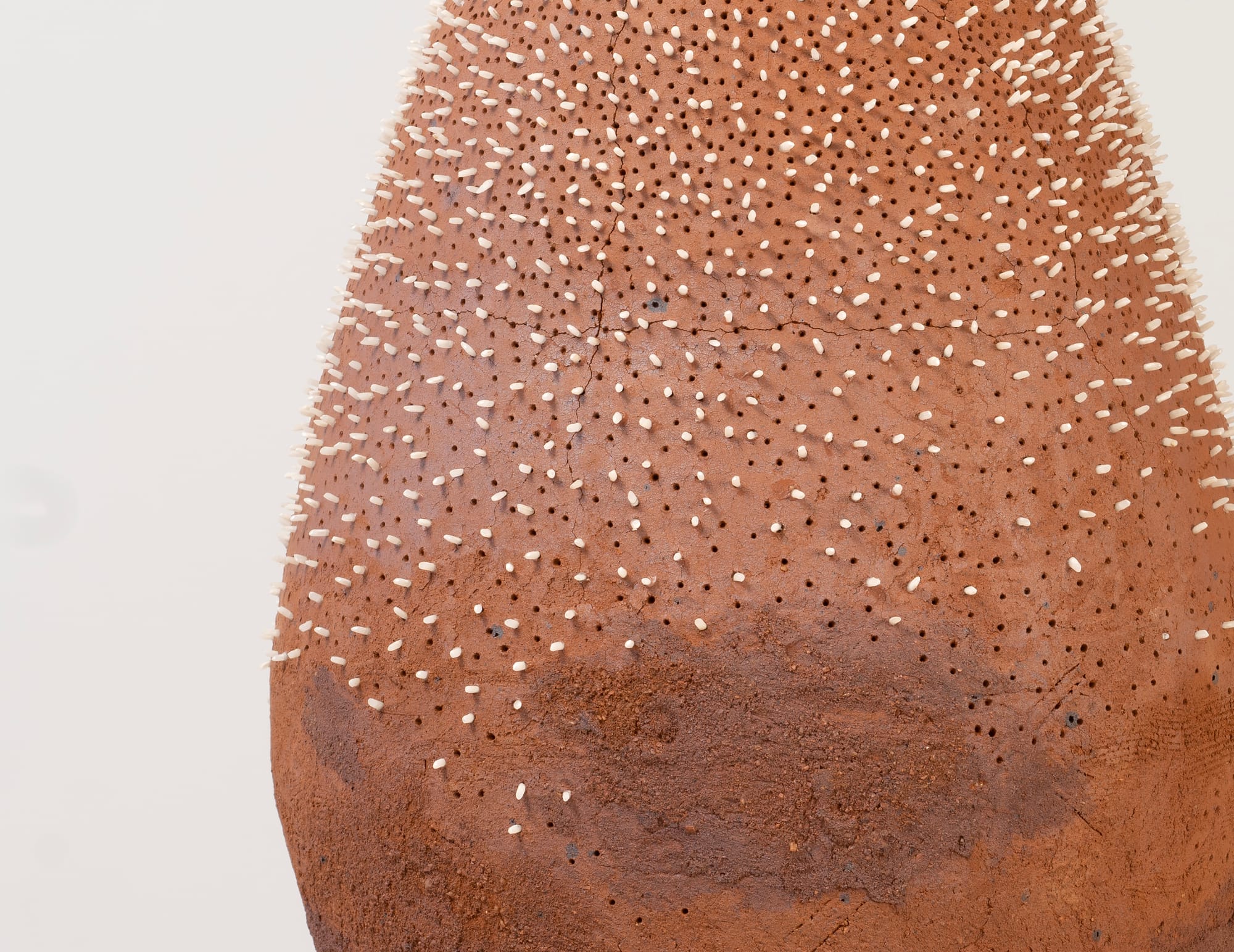 Stuffing the cavities and cracks of the hardened soil-clay with Black hair activates the physical remembrance of these enslaved laborers who were not just unceremoniously buried in naturally reclaimed graves, but intentionally disposed of, discounted, and forgotten through American history under the lens of white supremacy. The rice born from the hands of Gbadebo's ancestors and land they were laid to rest in speaks to their forced labor and the commoditization of the Black body as the backbone of the American economy.