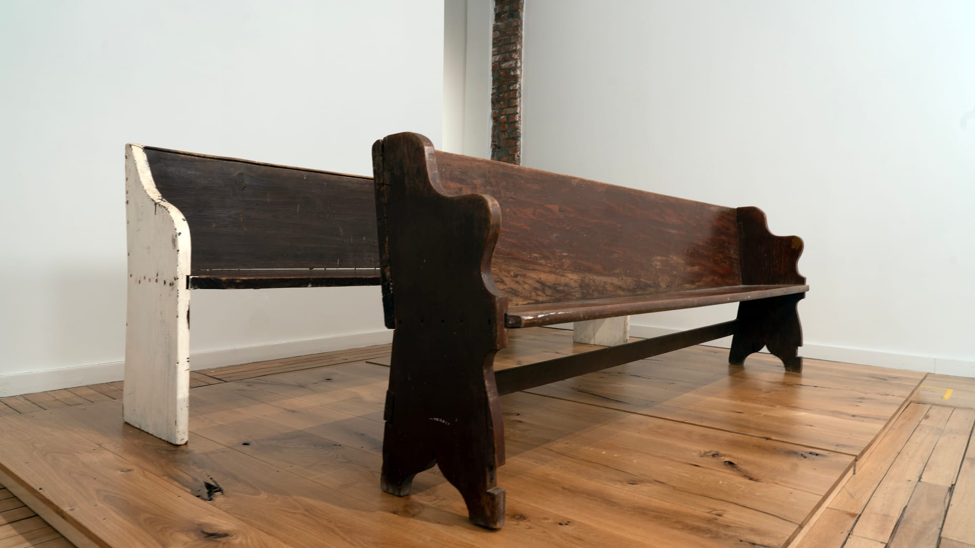 Two wooden church pews sit further back on the first floor, scuffed and scraped from years of wear and tear. Gbadebo told Hyperallergic that the pews were from the Old Jerusalem Church that her ancestors built on the True Blue plantation in 1890 after emancipation to worship as free people. She received the two pews as a gift from her cousin, Benny Haynes, who cares for the property. According to Gbadebo, the descendants of the True Blue plantation owners have converted the Old Jerusalem Church into a hunt club.