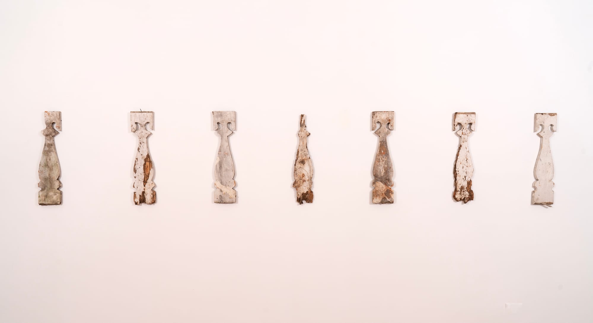 Gbadebo's works are shown in conjunction with the handwork of her ancestors as well. Back on the first floor, a set of beat-up balcony balusters are mounted on the wall across from Production (2022). The balusters belonged to the McCord House, built by Gbadebo's enslaved ancestors from the neighboring McCord family-owned Lang Syne plantation in 1849. She acquired the balusters from a contractor who was renovating the house, which is now owned by incumbent South Carolina governor Henry McMaster as of 2016 and serves as student housing.