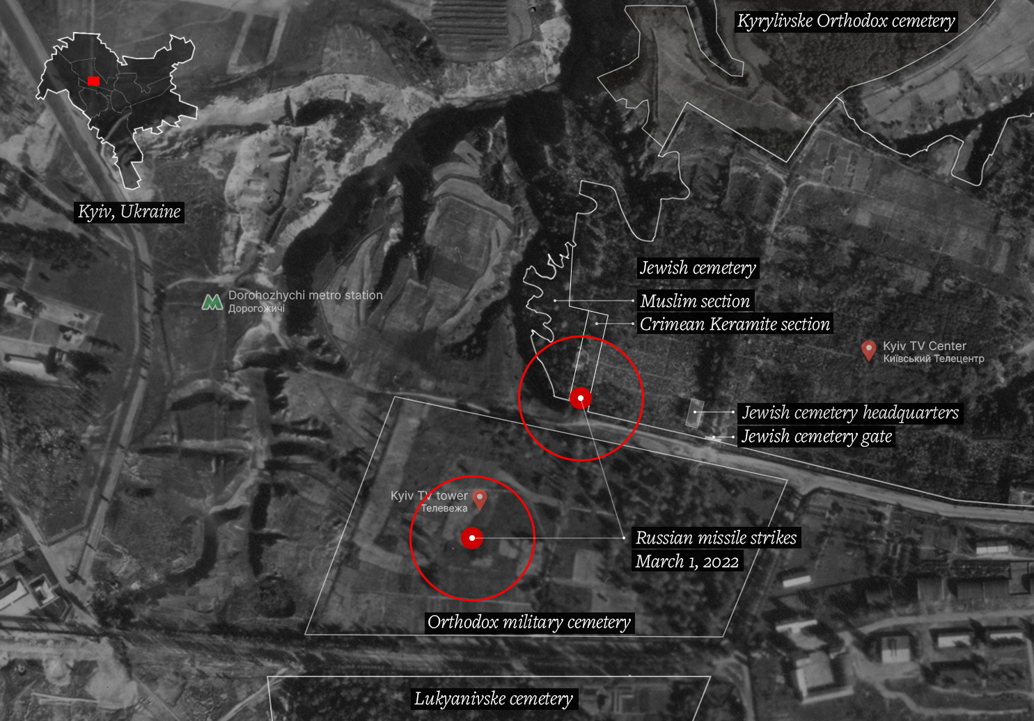Using archival topographic maps from the 20th century, photographs, and witness testimonies, researchers generated a digital model of the topography of Babyn Yar and how it had changed over the past century. This allowed them to identify the location of the first strike as a former Russian Orthodox cemetery, and the location of the second strike as a Jewish cemetery that also included plots for Muslims and Crimean Karaites.