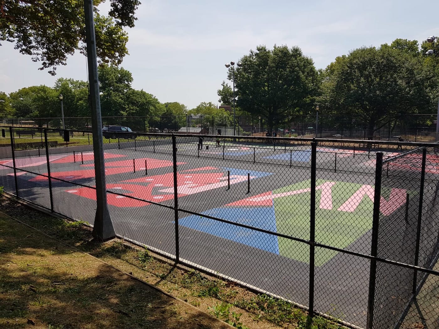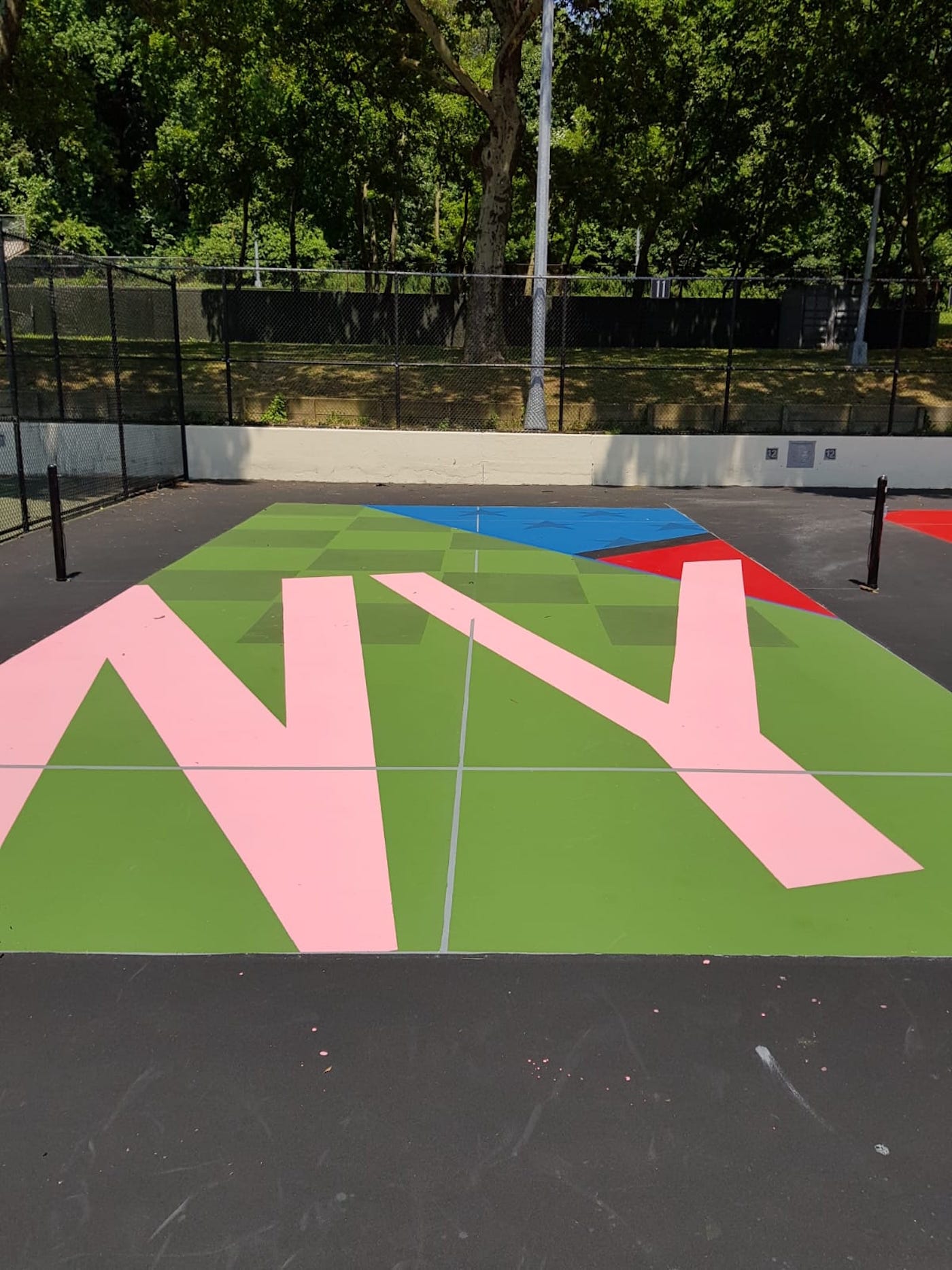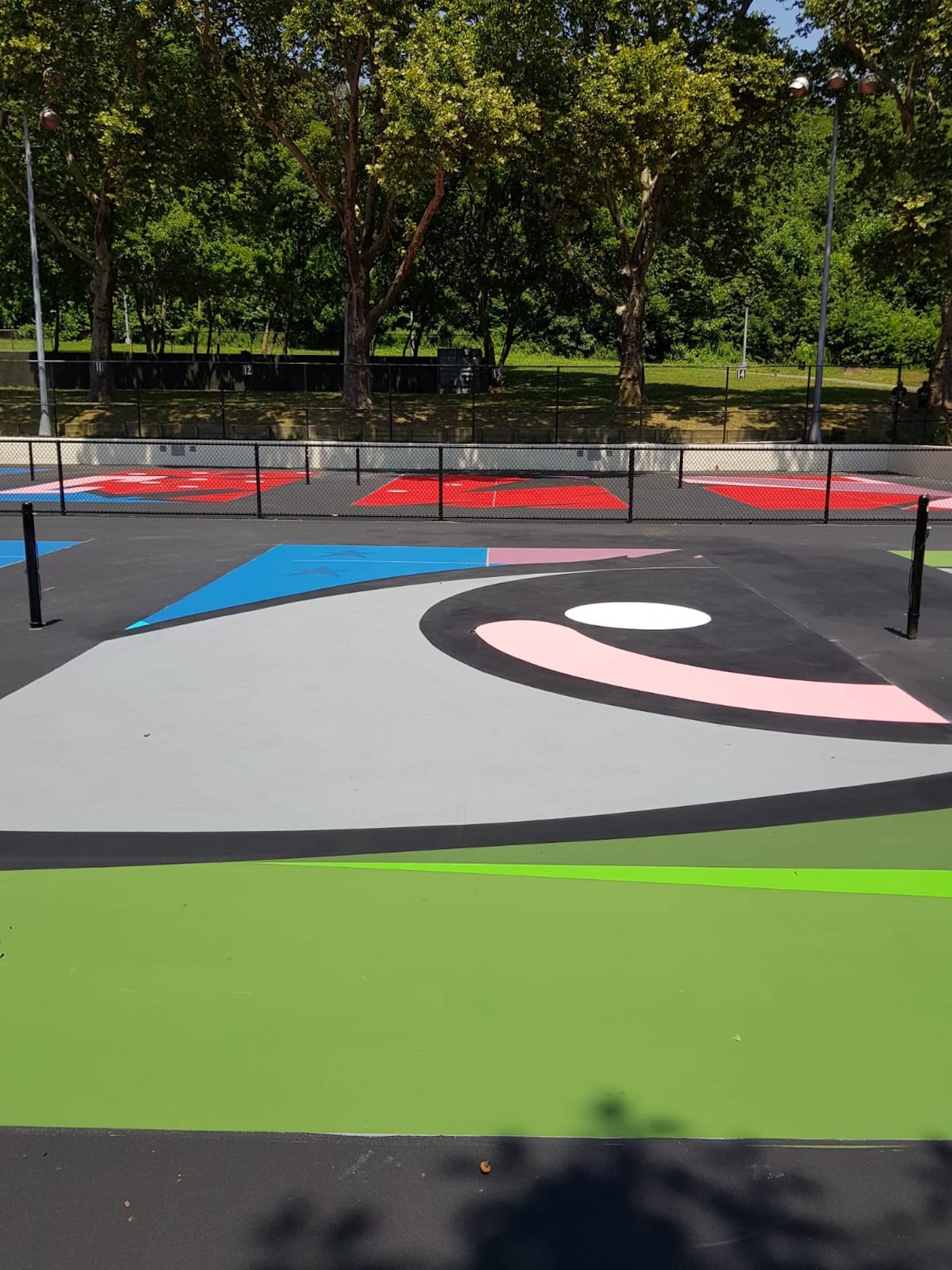 Naturally, the repainted courts in New York are the loudest of the bunch, exhibiting a technicolor design that appears inspired by Roy Lichtenstein’s comic book pop art. They are the work of Sen2 Figueroa, a self-taught graffiti writer and artist born in Puerto Rico who now lives in Cypress Hills, Brooklyn just blocks from his painting project in the borough’s Highland Park.