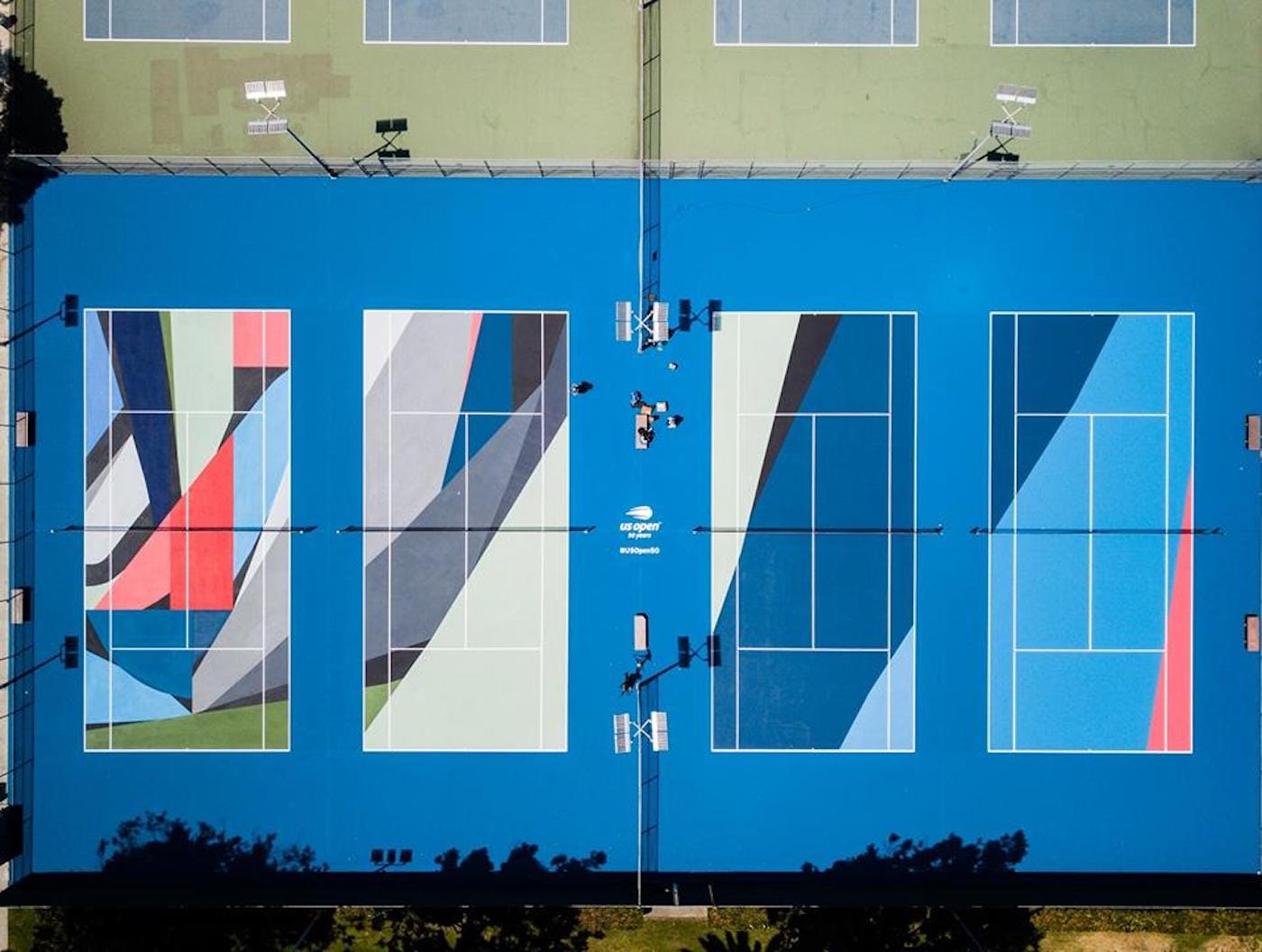 There’s been an obvious care taken to showcase local talent while supporting underserved communities not traditionally associated with the sport of tennis. In Miami’s Hileah Park, Kiik Create (the artist duo Manoela del Pilar Madera Nadal and David Gray Edgarton) has engendered a more psychedelic spectacle. One court’s dividing net radiates bold, multicolored steaks of light that form two giant hearts. Charlie Edmiston painted the courts in Los Angeles, which are the most minimalist courts of the bunch. Like four panels of one enormous painting, Edmiston has shuffled most of the action to the first court in the series, which contains splashes of green, blue, white, and red. The chaos of this playing field dissipates in the proceeding three, ending in a simple tricolor pattern of navy blue, light blue, and pink.