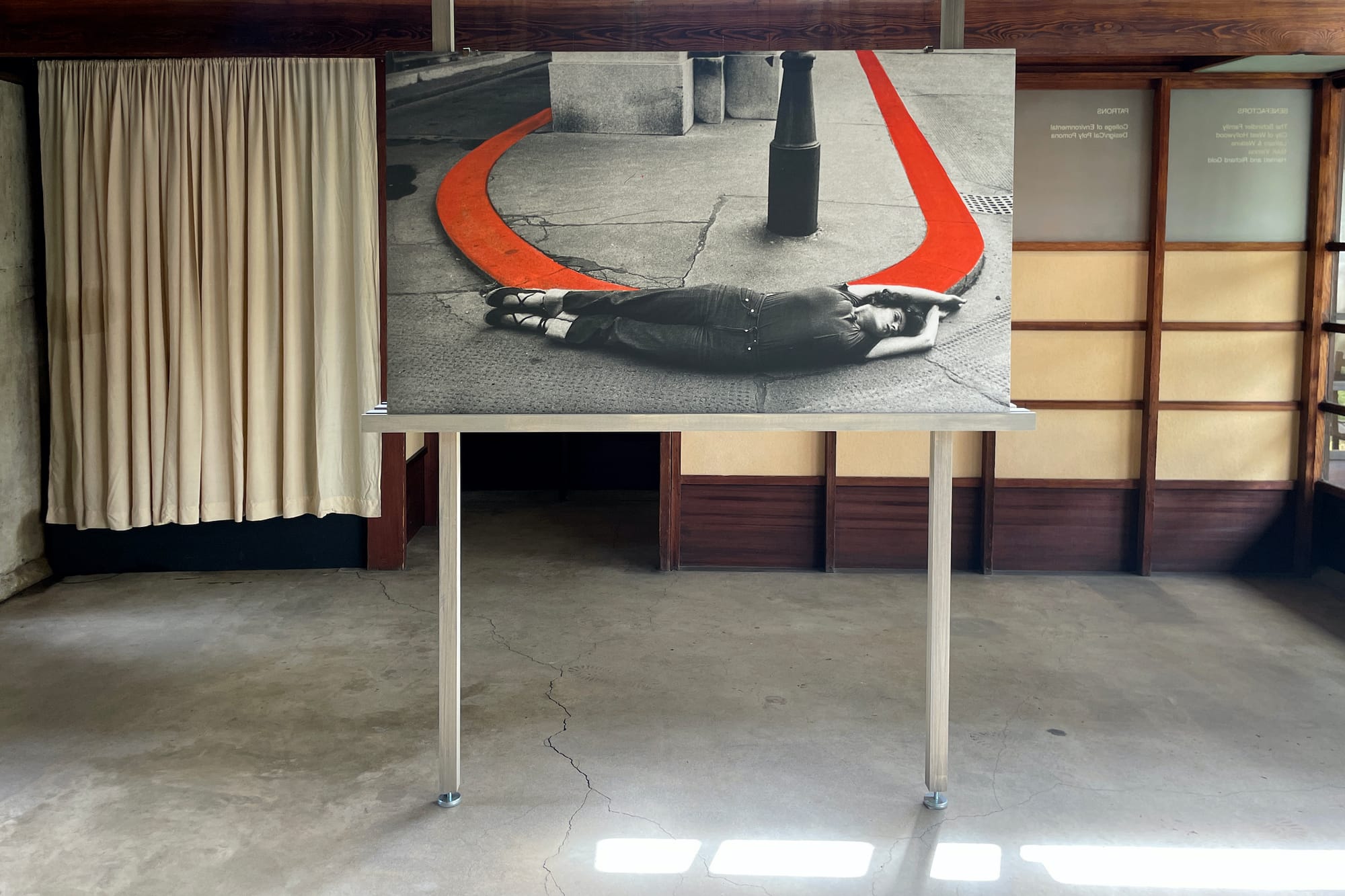 MAK Center for Art and Architecture installs a number of photographs and two videos from this series within the Schindler House for VALIE EXPORT: Embodied, curated by the center’s director, Jia Yi Gu. In these works, EXPORT exaggerates the instincts people have to disobey a built environment. In public parks, pedestrians may ignore walking paths in favor of more direct shortcuts across grass, carving “desire lines” into the dirt with their footsteps; or they may cut a hole in a chain link fence as they search for a direct path between public and private property.