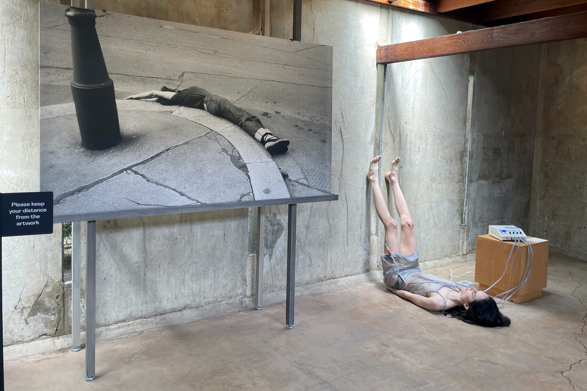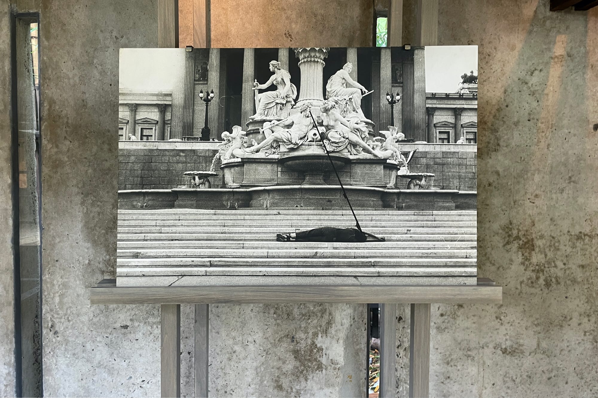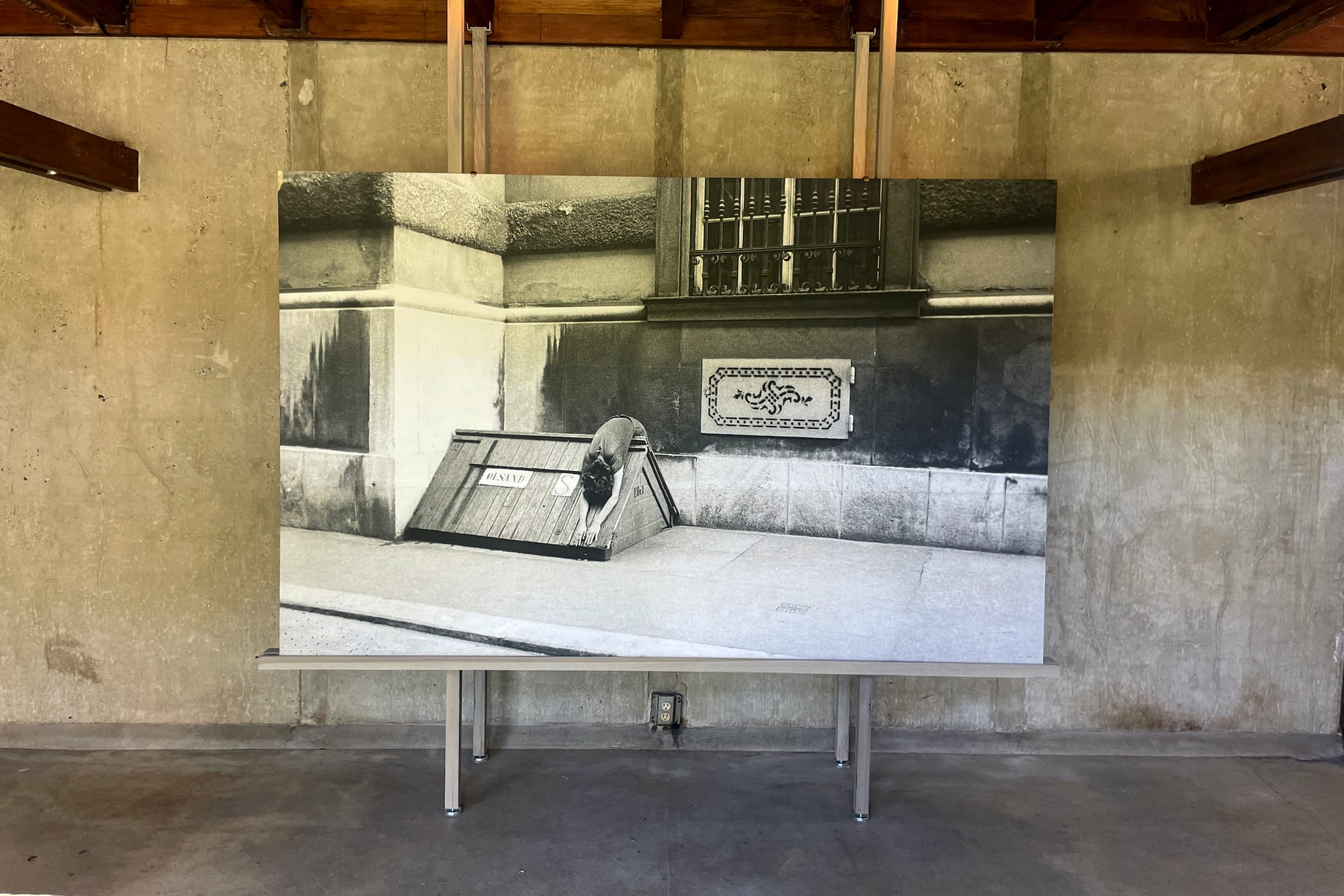 Some images, however, are haunting. For “DER MENSCH ALS ORNAMENT” (1976) she folds her body forward, draping over the A-frame of a wooden storage container built into the sidewalk. Her limp figure, hair trailing against outstretched hands, conjures an unsettling sense of helplessness, but the street is empty, with no one to discover the rag doll of a woman.