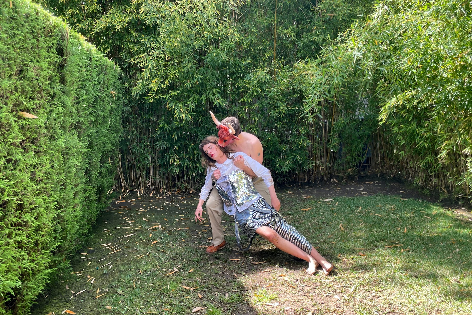 Six Los Angeles-based performance artists were invited to respond to EXPORT’s interventions during the performance program In Their Own Image on March 23, curated by Chloë Flores. With “sURGE,” Lara Salmon was hooked up to a muscle stimulator and allowed people to control the current of electricity that flowed through her body. She lay with her legs up against the wall, positioning herself as a vulnerable target, open to the abuse. Another performance, “Minotaur,” staged by Emily Lucid with Kyle Patrick Roberts, reenacted the Greek myth of Hercules and the Minotaur as a trans feminist love story. Hercules, played by Lucid, is embraced, rejected, and re-embraced by the beast, expressing the volatile landscape transgender people face in society.
