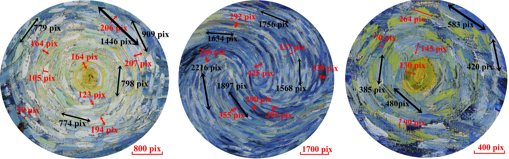 The research team examined the length of, space between, and varying luminance of van Gogh's brushstrokes from each of the 14 whirling eddies in "The Starry Night," and found that the composition intrinsically observes Richardson–Kolmogorov’s cascade picture of turbulence, specifically Kolmogorov's −5/3 Power Law. Put simply, this predicts that turbulent flows experience energy cascades during which larger eddies transfer some of their energy into smaller ones, and that those, in turn, transfer their energy into even smaller eddies, and so on.