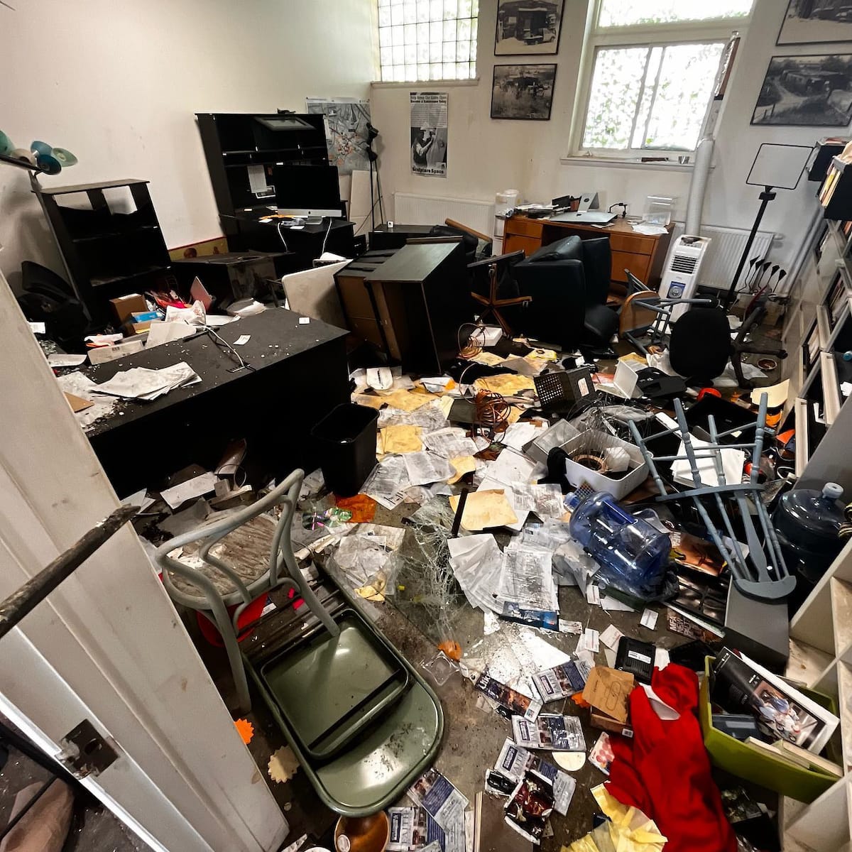 According to Sculpture Space, the vandals used materials they found inside the studios — including paint, sledgehammers, and torches — to smash windows, wreck the office (which included computers and archival documents), destroy kitchen equipment, flood the bathrooms and hallways, and destroy furniture, lighting fixtures, and video technology. The vandals also stole the artists' bicycles, according to the statement. Sculpture Space has not yet returned Hyperallergic's request for comment.
