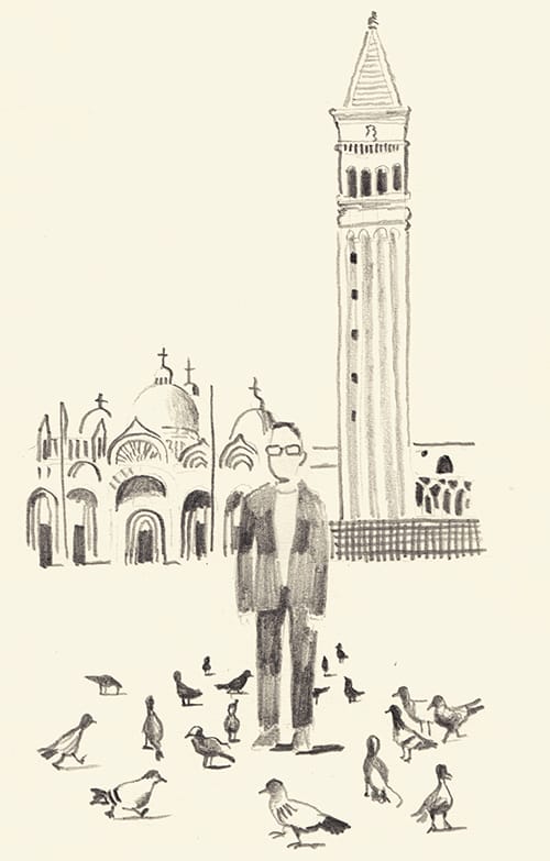 So far, the sketches show a mixture of bemusement and amusement. Trevisani’s “Saint Sebastian” inspires the designer while an old library filled with eggs in incubators is “wonderful.” A glimpse of “Big Bambu” by the Starn brothers makes Niemann think of his kids jumping off the structure into the canal. It seems like Niemann is pretty well equipped to handle the trials of the world’s biggest contemporary art show.