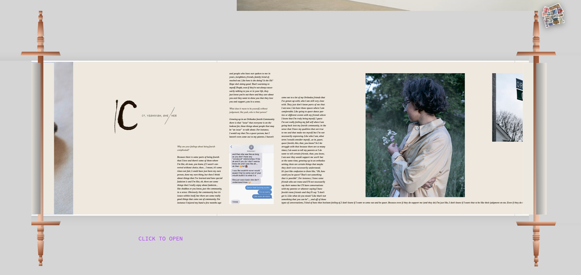 Other artists strive to uncover the stories of underrepresented groups within Yiddish-speaking communities. Shterna Goldbloom’s series Feygele takes the Torah scroll as a substrate to tell the stories of LGBTQI+ Jews. While they have previously used handmade Torah scrolls to produce physical objects, for the Yiddishland Pavilion, Goldbloom’s project virtually unscrolls to reveal photographs and interviews.