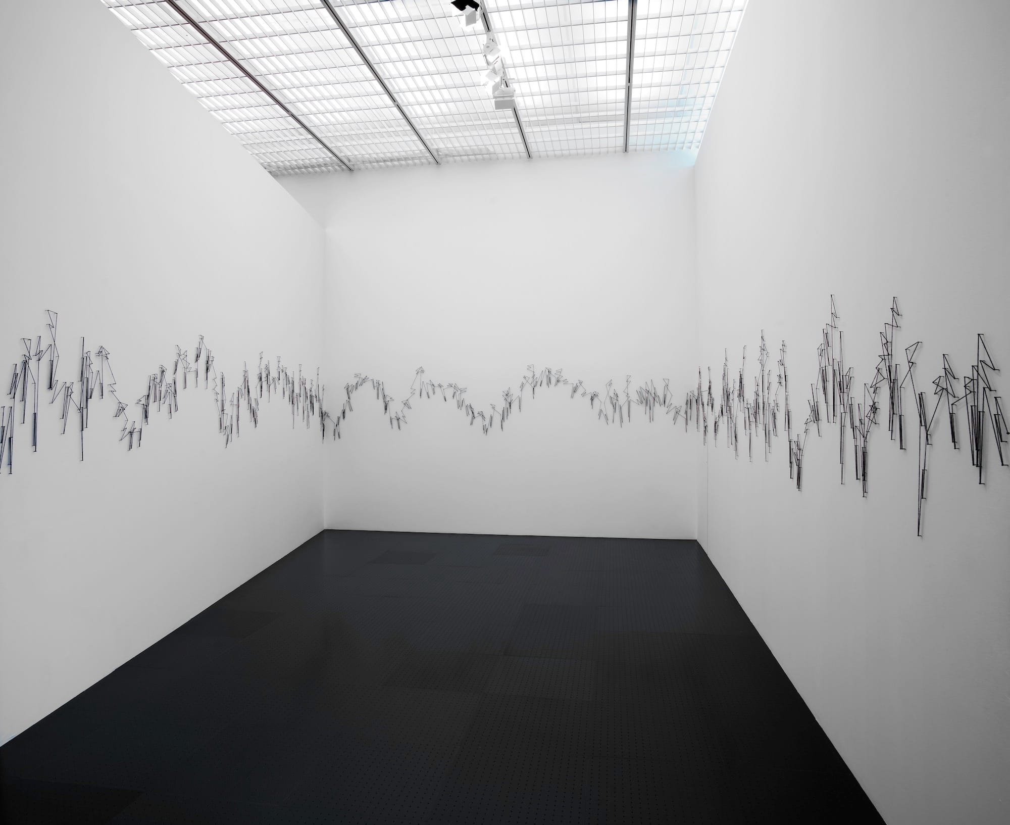 Installation view of Vera Molnár, "OTTWW" (1981–2010), black thread, black nails, dimensions variable (© Adagp, Paris 2024; photo by Bertrand Prévost - Centre Pompidou, MNAM-CCI /Dist. RMN-GP)