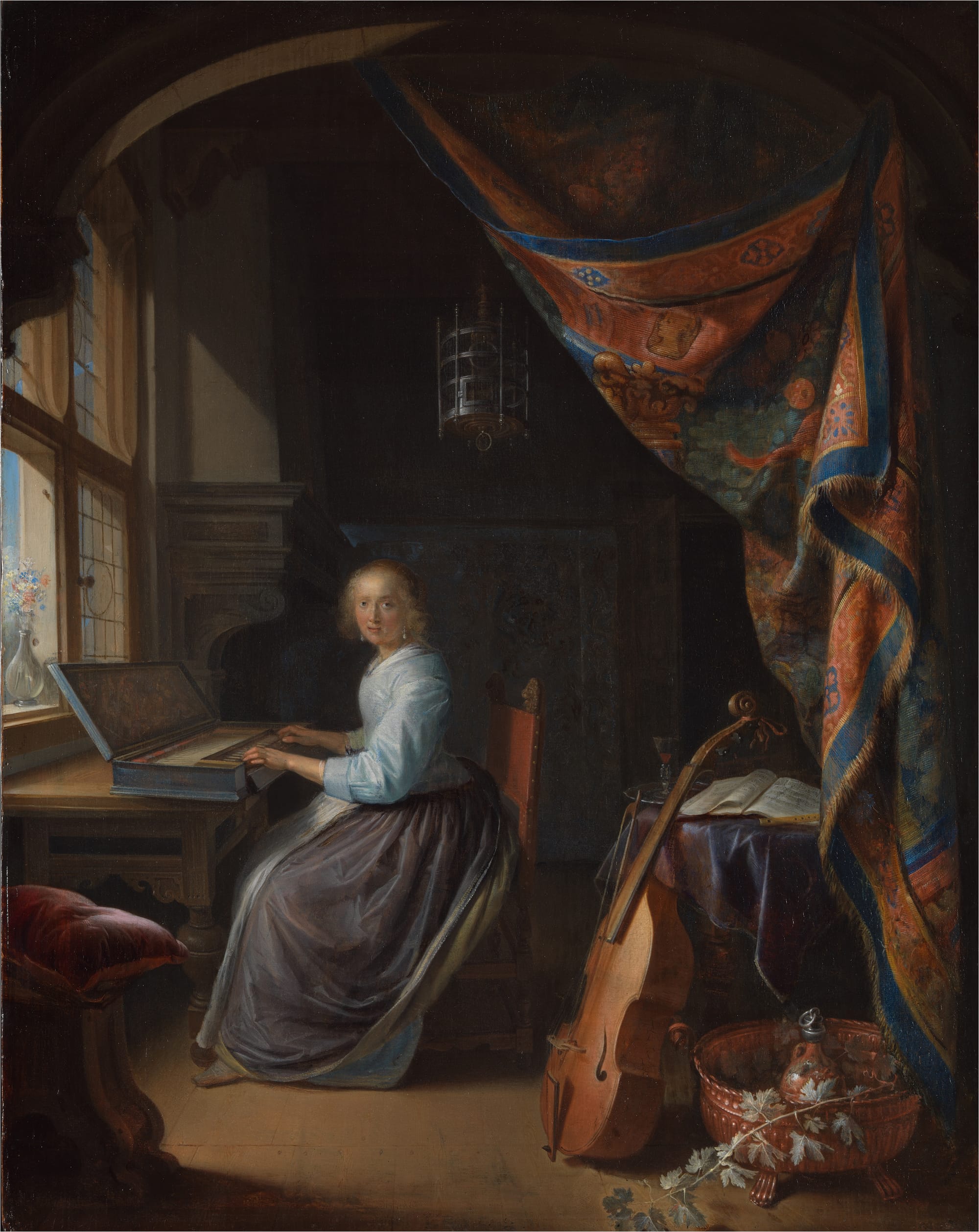 The inventor of this genre was the painter Gerard Ter Borch. After producing a series of startlingly realistic scenes of peasants at work, in the mid-1650s, he turned to small-scale domestic scenes starring his half-sister, Gesina, in resplendent satin dresses. (Gesina herself was an accomplished amateur painter.) Other artists took up this genre, including Johannes Vermeer, who had been trying his hand at large-scale history painting, but quickly saw the appeal of painting smaller, refined domestic interiors.