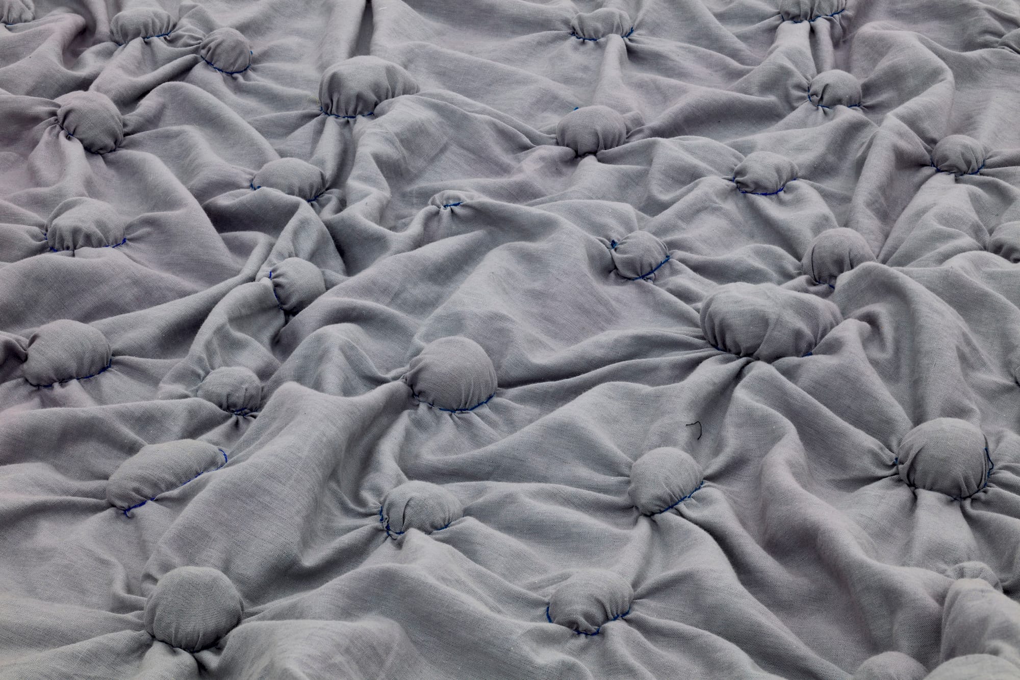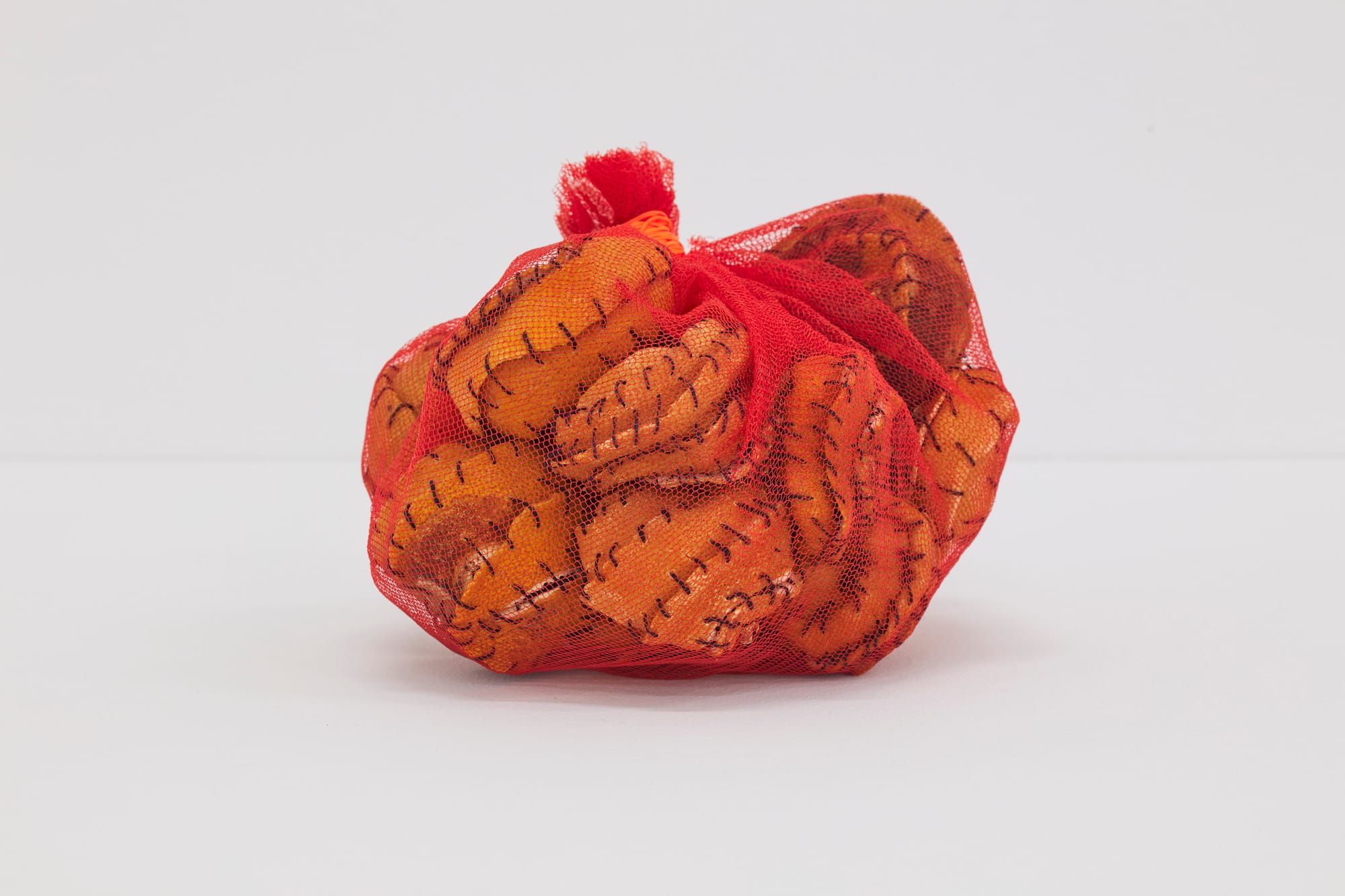 In “Tidal” (2020), avocado stones are sewn inside a blue duvet cover, evoking seeds lying on the ocean floor, ready to germinate given the right conditions. The piece is one of several references in the exhibition to duvets, weighted blankets, and cushions, suggesting themes of care, comfort, and therapy. “Its Own Cushion” (2020) is a collection of medical pillows, both as found objects and as versions cast in plaster, heaped together like giant bean pods. Hard and brittle, the cast cushions are devoid of their original function, disrupting simplistic notions of healing and restoration.