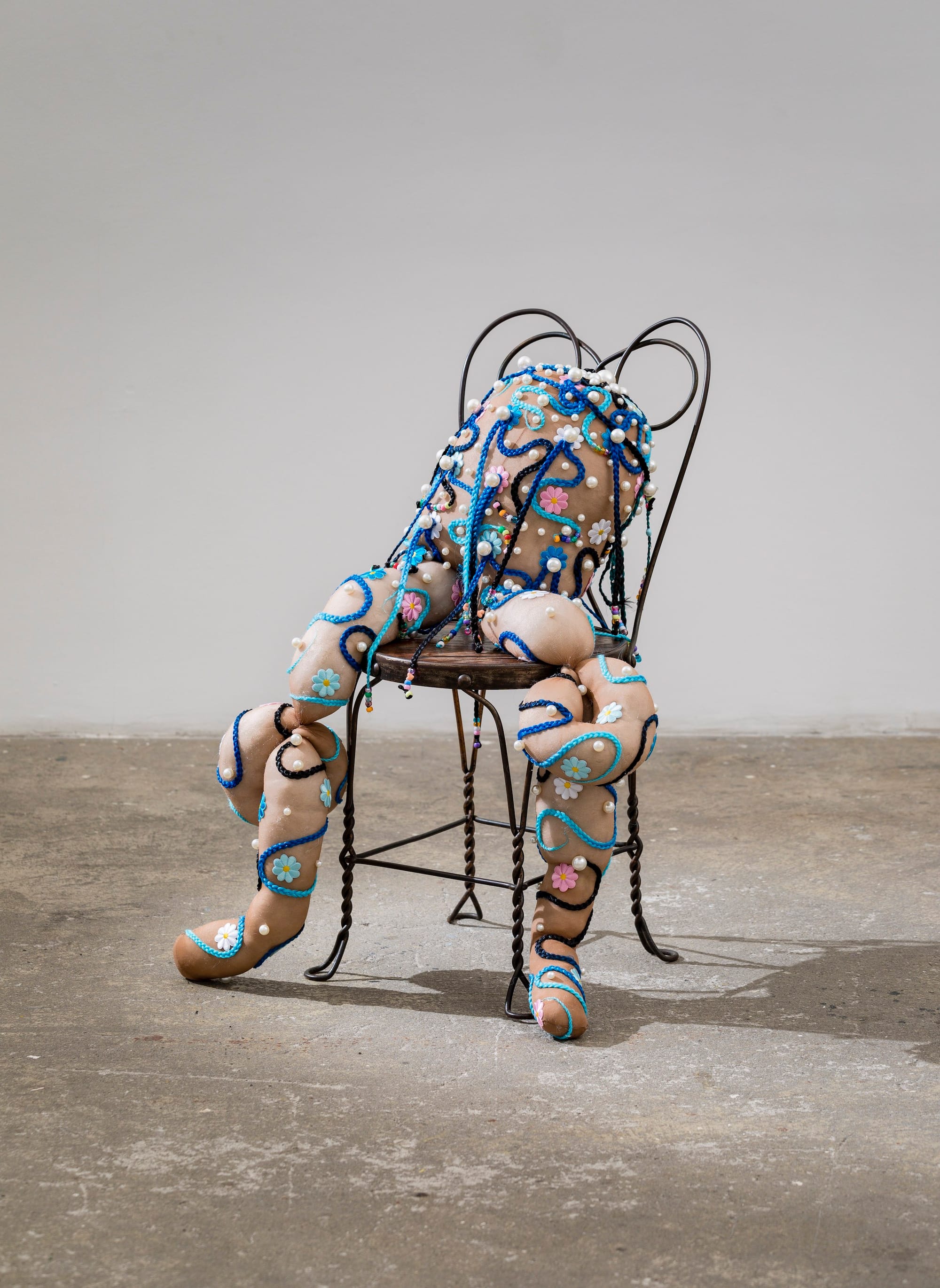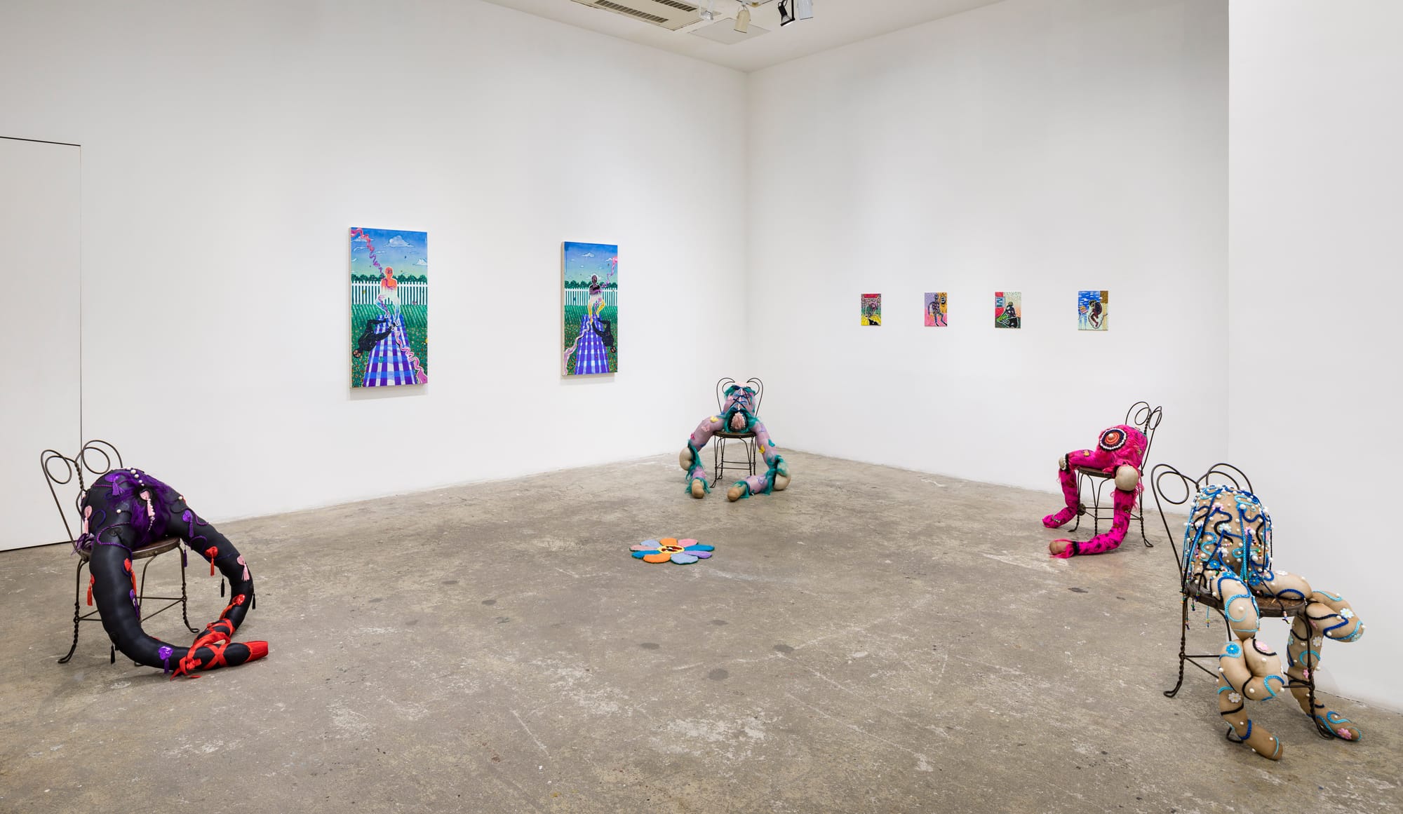 Out of Body, Victoria Dugger’s debut solo show at Sargent’s Daughters, is a deft exploration of the tension between interiors and exteriors. Internal tubing bursts from the knotted kneecaps of soft sculptures; organs stretch outside of their corporeal confines and out of frame in mixed-media paintings. For Dugger, who is disabled, bodies are mutable and prone to rupture, yet they remain expansive — cosmic even — twisting and unfurling in a way that feels potentially liberatory.