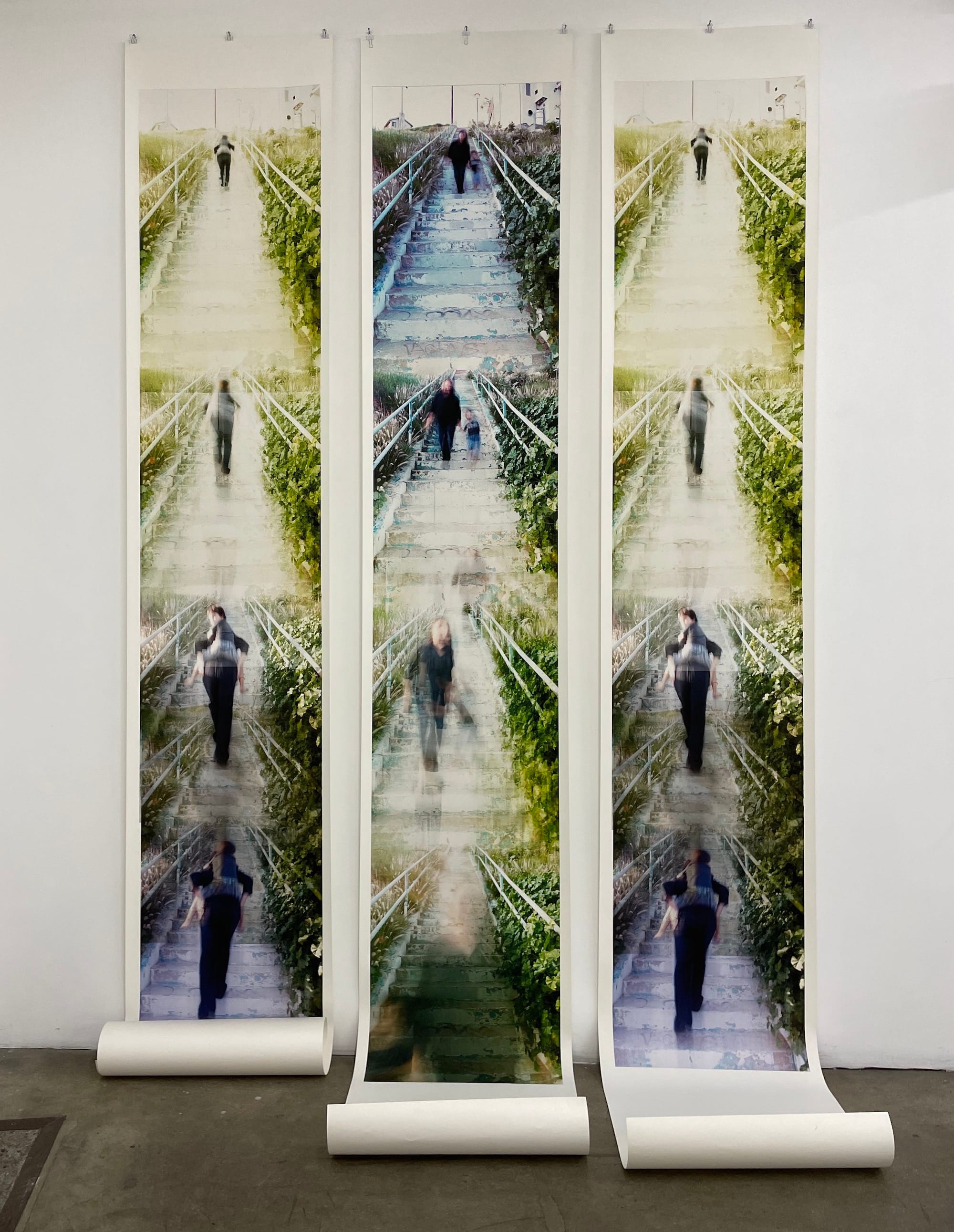 An ecological warning is inherent in any images of humankind encroaching upon nature — all the more in California, where wildfires and other weather disasters take an ever greater toll on the environment. The desiccated weeds and bare trees in Fernandez’s “End of Road” (2010) and “Tiny Trees” (2009) show an environment that’s already been exhausted by humankind’s intrusions and extractions; and the photo installation “Sisyphean Act I” (2010) shows a human exhausted by the never-ending cycle of responsibilities. The mid-century modern home that just barely peeks out above the brush in Jude’s “Pasadena, CA” (2007) is an even more insidious portrait of encroaching culture.