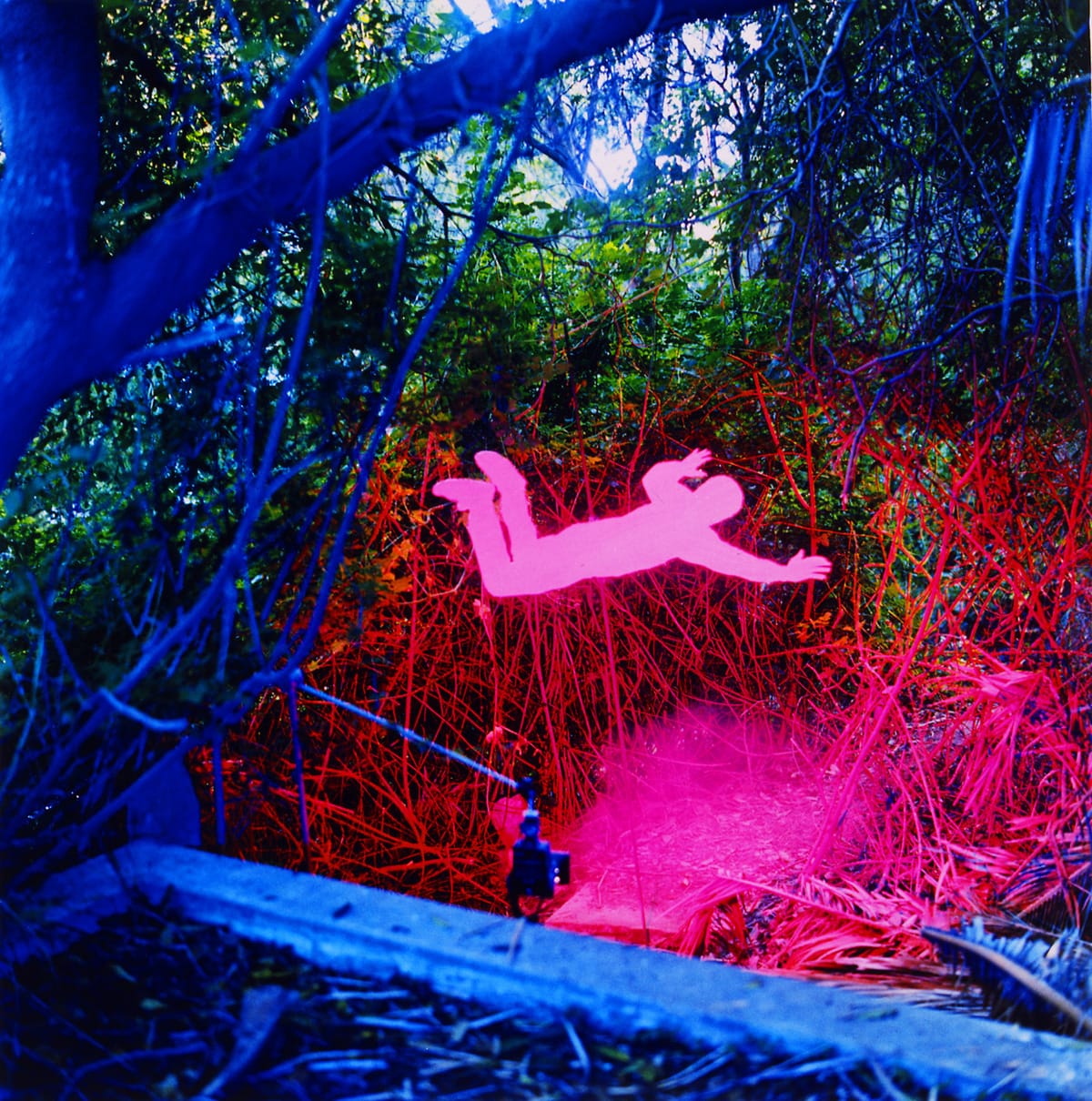 The photos that comprise Divola’s Five Prints Portfolio (1987) are the exhibition’s eeriest works, and the ones that most evocatively portray people as the most lost of all animals. In “House,” a toy house sits askew amid a web of branches, a tiny intrusion on the natural world, bathed in artificial red light; in “Desire,” a bust of a horned animal on a tall plinth, saturated in a deeper red, beckons. “Flying/Falling” centers on a bright pink human silhouette flailing above a pit of neon brush. The image invokes all kinds of strange phenomena, from alien abductions to the legend of hijacker D.B. Cooper. However it’s interpreted, the person is at the mercy of external forces.
