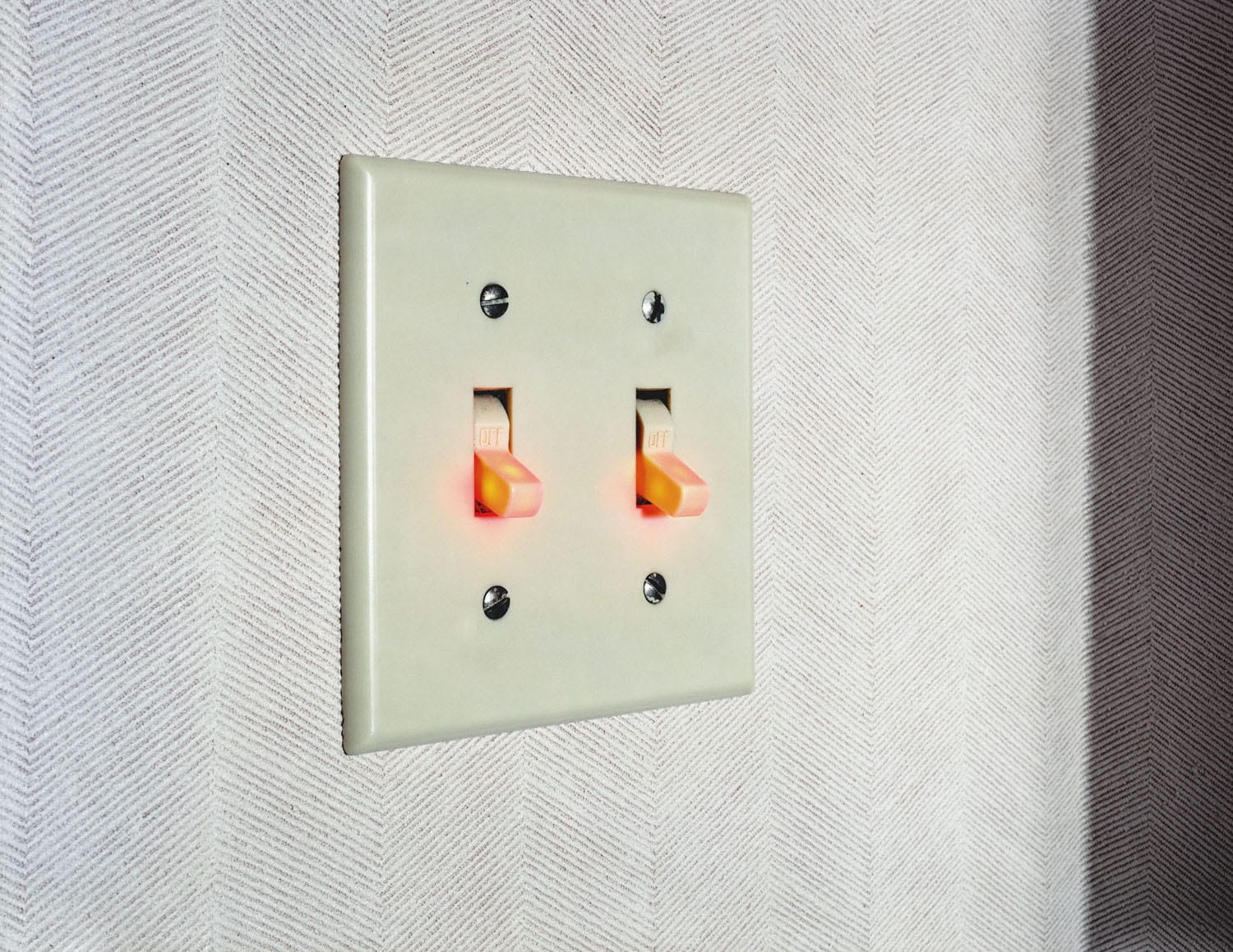 But conquering nature also means conquering solitude, and much of the work in Five Southern California Views speaks precisely to the anxiety that underlies human relationships with both open space and the absence of others. The tight focus on glowing light switches screwed to a white wall of what might be a motel room in Jude’s “Pismo Beach, CA” (2007) creates a claustrophobic atmosphere intensified by the banality of the space. Instead of the coastal town’s idyllic landscape, Jude traps viewers in generic non-place that resonates today with the pandemic’s isolation panic.