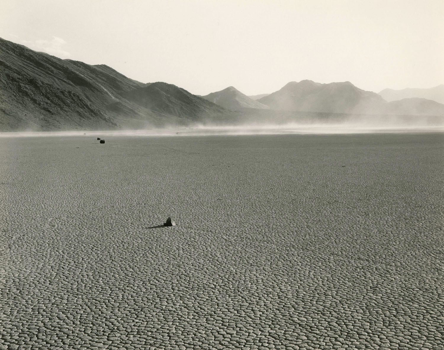 At the other end of the spectrum is Ruwedel’s “Moving Rock #8 (The Racetrack)” (2000/2021), where a few rocks are the only indigenous inhabitants of an inhospitable desert landscape, or Heyliger’s “VVVVVVVVVVVVV (032802F3)” (2021), a glistening sheen of ocean that overwhelms the one tiny stick figure of a person.