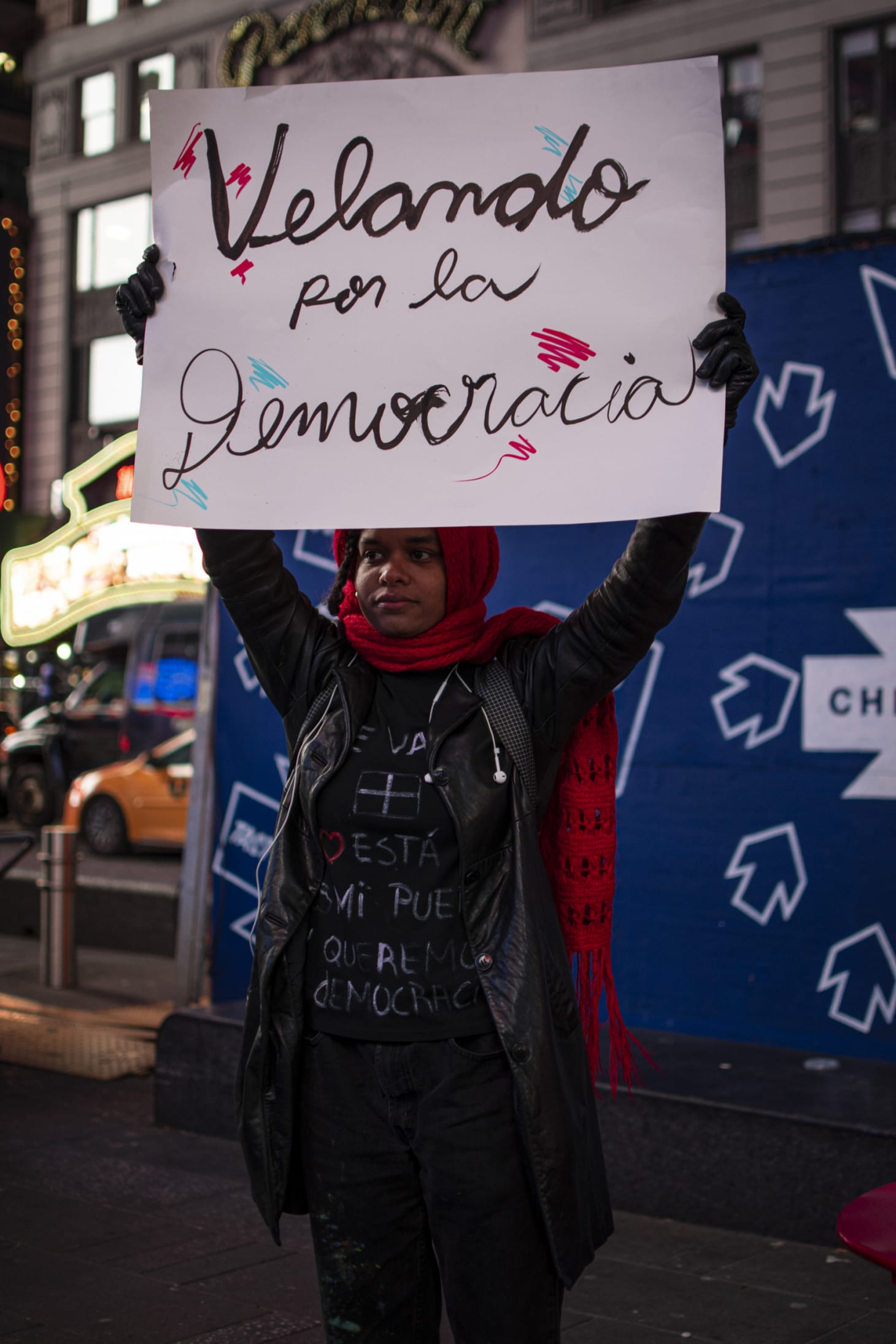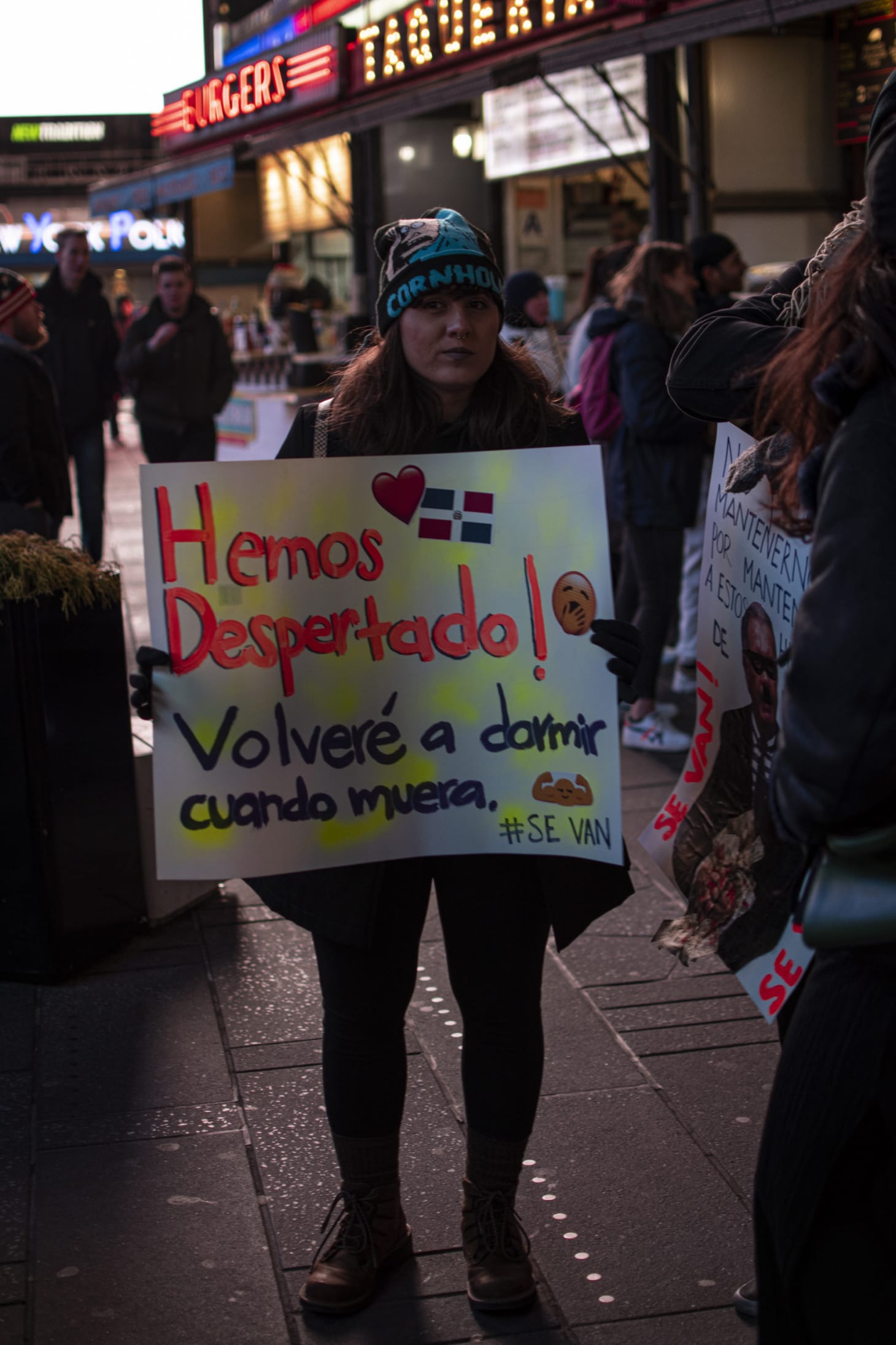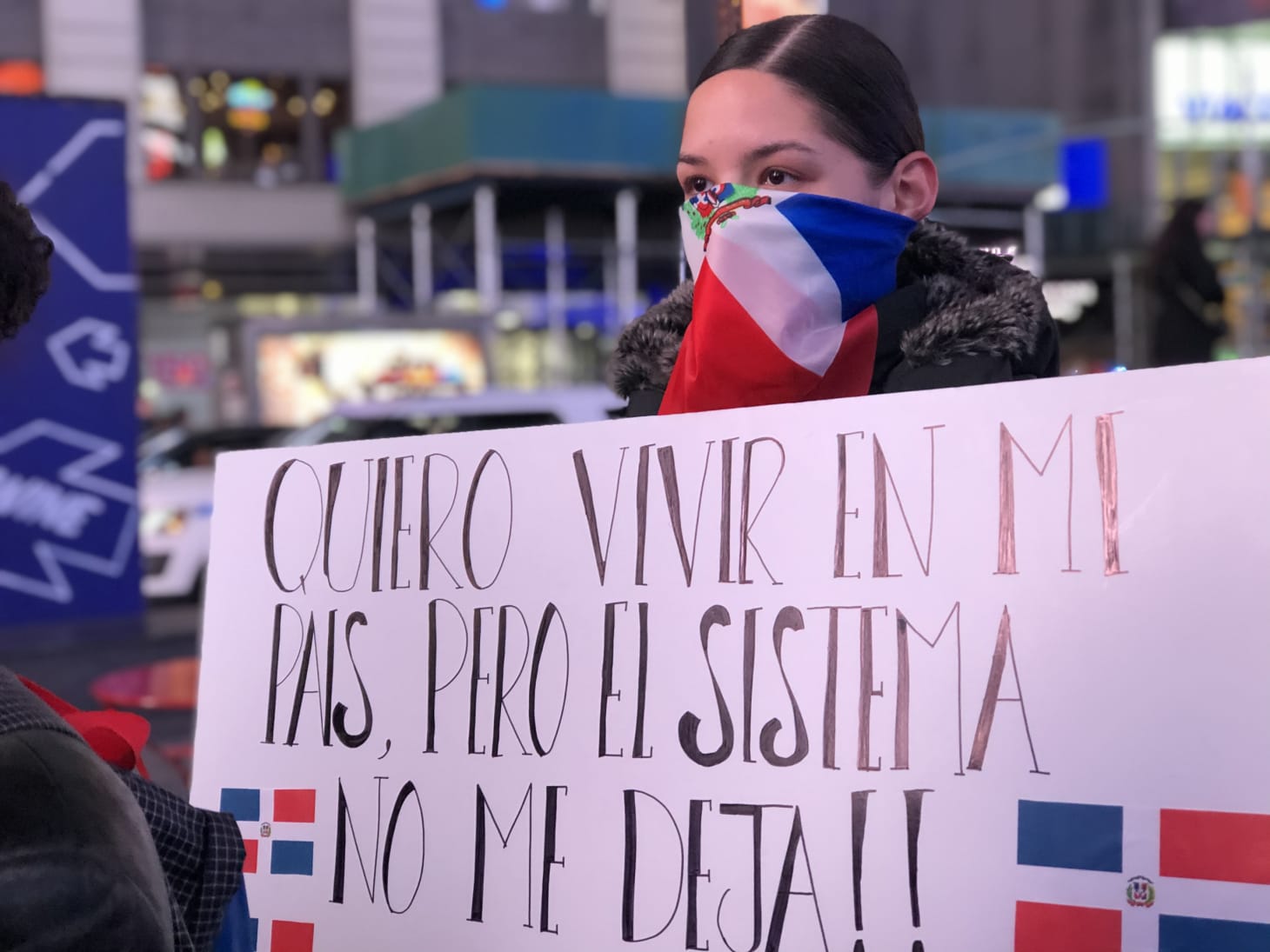 Around 70 protesters gathered near the Embassy of the Dominican Republic in New York City’s Times Square on Thursday, February 27 to demand electoral transparency and accountability on the island in a “Velada para la democracia” (“Vigil for democracy”). Organized by an all-female group of Dominican immigrant artists, it was one of numerous such demonstrations around the world over the past few weeks, including a protest in the historically Dominican neighborhood of Washington Heights in Manhattan that flooded the streets by the thousands.