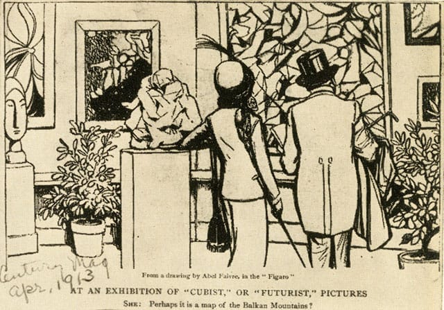 Abel Faivre, “At an Exhibition of ‘Cubist’ or ‘Futurist’ Pictures,” The Century, April 1913Clare Briggs (1875–1930), “The Original Cubist,” New York Evening Sun, April 1, 1913Thomas E. Powers, “Art at the Armory by Powers, Futurist,” New York American, Feburary 22, 1913“With the Cubists and Futurists,” Puck, March 19, 1913Alek Sass, “Nobody Who Has Been Drinking is Let in to See This Show.” New York World, February 17, 1913Winsor McCay, “The Modern Art Show,” New York Herald, 1913.M. T. “Penny” Ross (1881–1937), “Mamma’s Angel Child has a Cubist Nightmare in the Studio of Monsieur Paul Vincent Cezanne Van Gogen Ganguin,” 1916 (click to enlarge)Mary Mills Lyall and Earl Harvey Lyall, The Cubies’ ABC (New York: G. P. Putnam’s Sons, 1913; repr. New York: Readymade Press, 2010). (image Courtesy Francis M. Naumann Fine Art, New York via armory.nyhistory.org)Robert W. Chanler (American, 1872–1930), “Parody of the Fauve Painters” (1913), oil on hardboard, 38½ × 45½ (97.8 × 115.6 cm). Woodstock Artists Association and Museum Permanent Collection, gift of Gertrude Jarvis, 1974-20-01)F. Fox, “Cubisto Picture Composed by Dad, Under the Inspiration of the Incoming Bills for the Ladies’ Spring Purchases,” New York Evening Sun, April 8, 1913. (General Research Division, The New York Public Library, Astor, Lenox and Tilden Foundations)“Art, Past, Present, Future,” Life, April 24, 1913, 83. (New York Society Library)Frederick Opper (American, 1857–1937), “The ‘New Art’ Fest,” New York American, Feburary 27, 1913, 20. (From the Library of Congress, Chronicling America: Historic American Newspapers)John T. McCutcheon (American, 1870–1949), “How to Become a Post-Impressionist Paint Slinger,” New York Evening Sun, March 6, 1913, 11. General Research Division, The New York Public Library, Astor, Lenox and Tilden Foundations