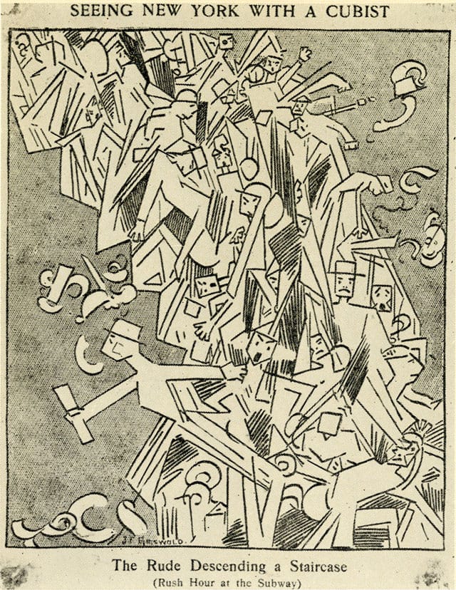 J. F. Griswold’s “The Rude Descending a Staircase (Rush Hour at the Subway)” obviously was looking to Marcel Duchamp’s “Nude Descending Staircase” (1912) as a model of the cacophony of modern life. The comic first appeared in the New York Evening Sun, March 20, 1913. (General Research Division, The New York Public Library, Astor, Lenox and Tilden Foundations via armory.nyhistory.org)