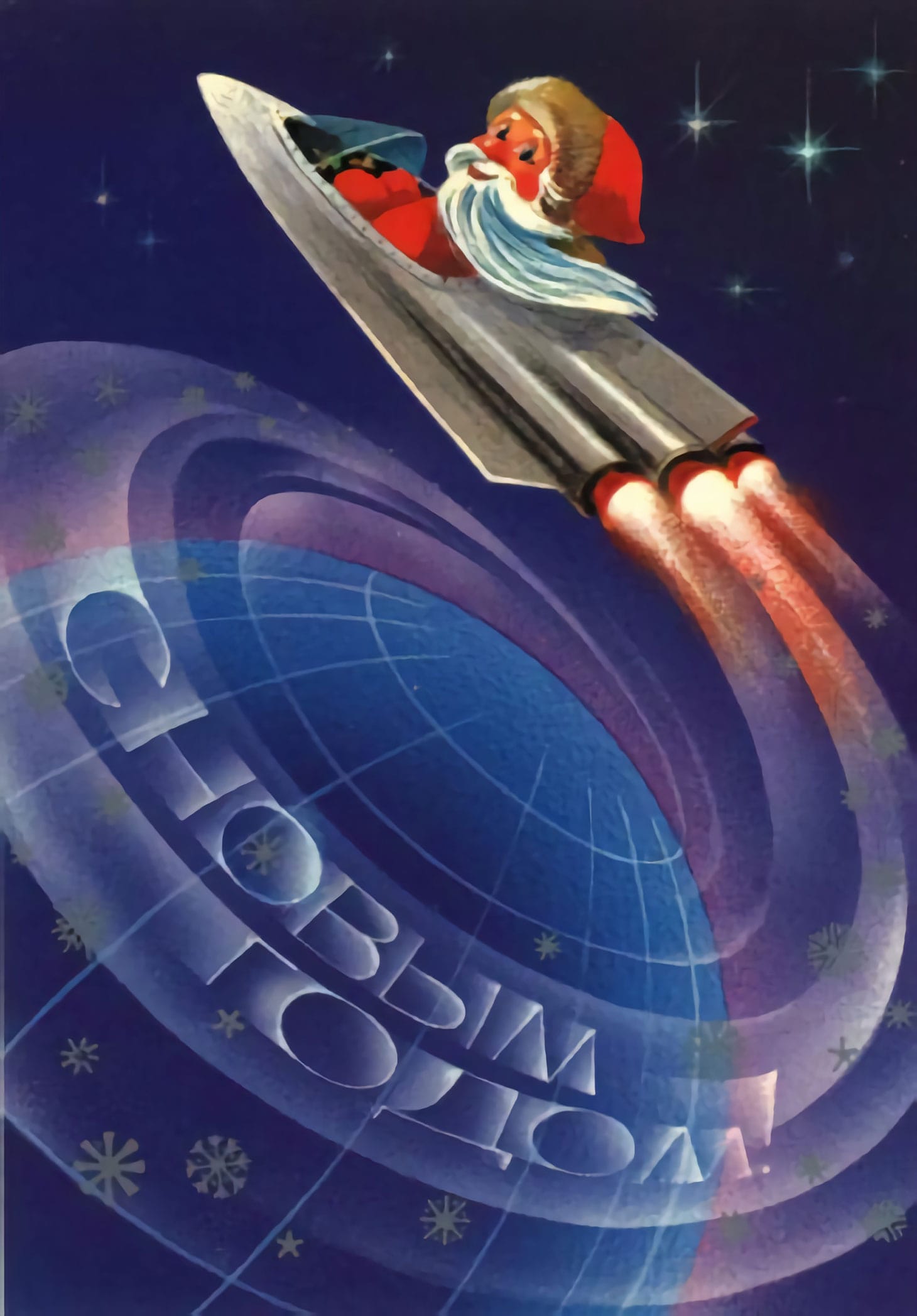 When the government was trying to drum up support for research into nuclear power, they molded ornaments in the shapes of nuclear-powered rockets, icebreakers, and automobiles. The famous Arctic explorer and Hero of the USSR, Otto Schmidt, dressed up as Ded Moroz to visit classrooms and hospitals every New Year’s. It’s easy to see how one idea led to another: if Ded Moroz could advance the glory of the state by exploring the North Pole, why not make his next expedition a voyage to the stars? Thus we have Grandfather Frost soaring through skies, striking a definitive victory in the Space Race with his sack of gifts clutched firmly in hand.