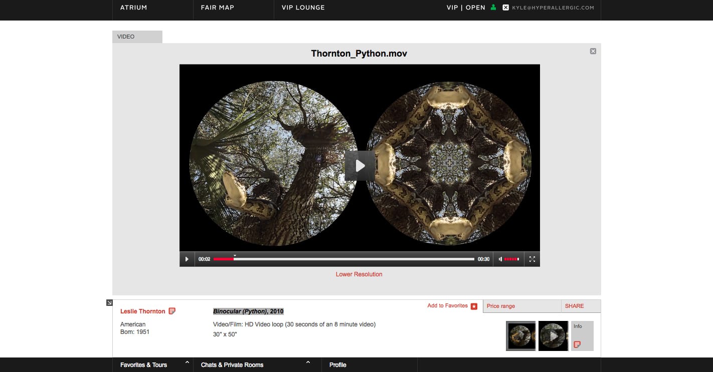 My own experience with the VIP Art Fair has been lackluster, but not unimpressive. The online interface for the fair doesn’t feel as up to date as it should. Director Noah Horowitz pointed out to me that the lack of Flash was a purposeful move towards simplicity, but the total lack of smooth movement between pages and panels of the fair site feels cheap. The images provided by galleries for their art work are certainly high-resolution and detailed, but no amount of pixels can change the fact that the pieces have no depth whatsoever. Photos shot from an angle might help some pieces, but those often aren’t provided in the works’ related media tab found on the site’s bottom menu. The media tab is pretty sweet for videos, though. On Winkleman gallery’s page, high-quality videos of Leslie Thornton’s “Binocular (Python)” (2010) are readily available. It’s a great formal interface for video art, kind of like a gallery-personalized Vimeo.