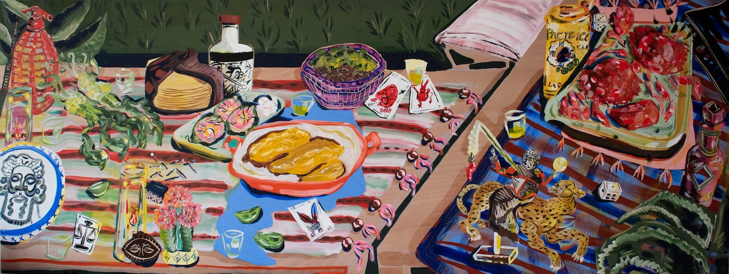 Kate Pincus-Whitney has long been fascinated by the theatricality of shared meals. “For me, the table acts as the stage for the dramas of human life,” she explains of her ongoing series Theater of the Dinner Table. Each large-scale acrylic painting, rendered on a wooden door, is an attempt to gauge the myriad ways the objects we consume and surround ourselves with become part of “our cultural and psychological understanding of self.” At the time she began creating “Dionysian Drinking Games” (2020), Pincus-Whitney was thinking a lot about the Eleusinian Mysteries, the secretive ancient Greek initiation rituals held yearly by the cult of Demeter and Persephone, as well as about Dionysus, Carl Jung, and the writings of Joseph Campbell. Populated by eccentric accoutrements and brightly colored textiles, the dense painting gestures toward the layered mythologies and rituals she associates with food and the figures mentioned previously.