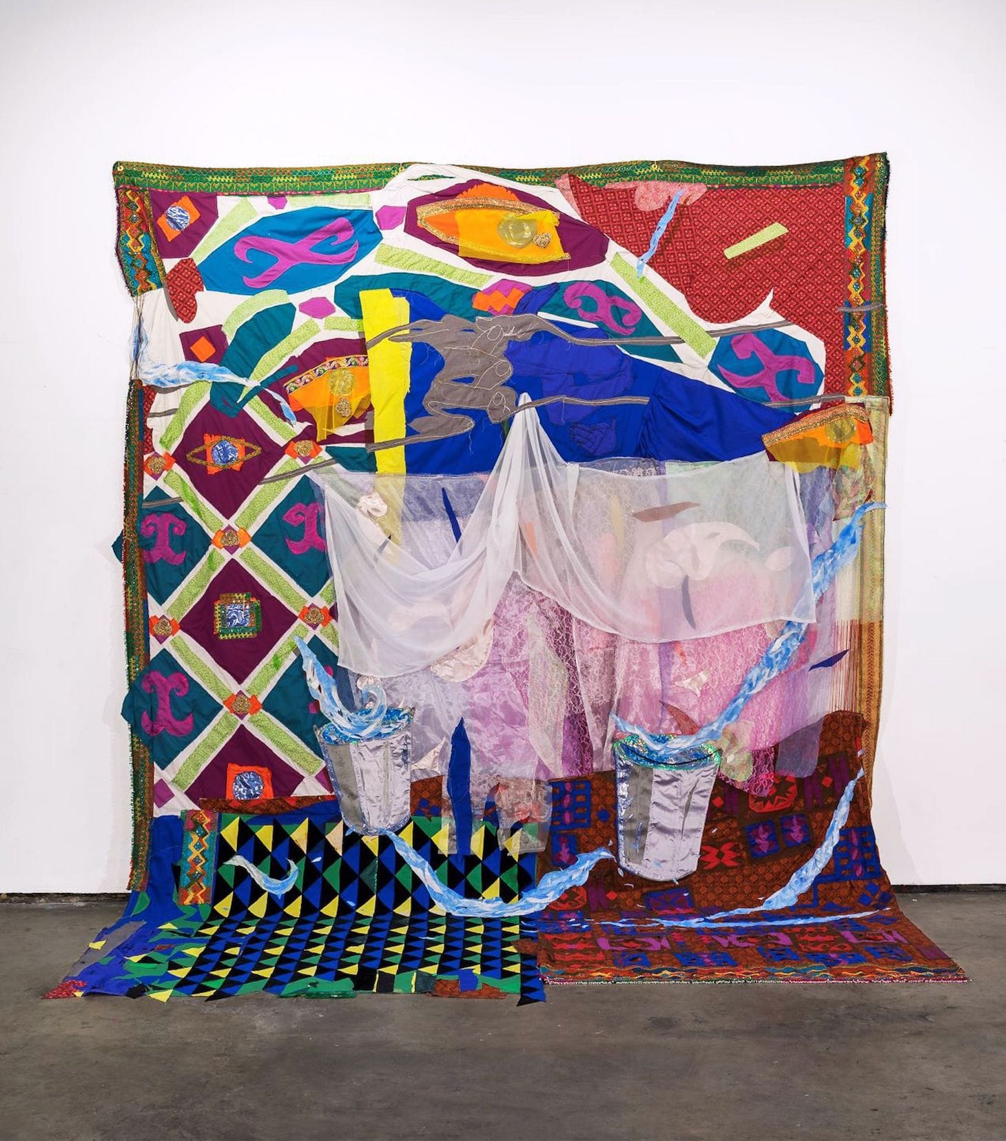Working between representational and abstract modes, Hangama Amiri seeks to “bring the experiences of Afghan women to visual art.” Her ornately textured works draw upon her own memories to emphasize place and color, and often take the form of large-scale canvases, replete with brilliantly hued, embroidered textiles. Her recent work “Jannah/Paradise #1” (2020) nods to the literal translation of the term from Arabic, which connotes something that is hidden or unseen. Likewise, here Amiri is referencing the Islamic conception of paradise, a place of “peace and bliss where the faithful and righteous are rewarded,” as she noted over email. Interested in the cultural symbolism of this space, Amiri imagined this heavenly site as “a space of refuge that is also unseen to us […] an imagined space where women’s body, pleasure, and self-righteousness are only allowed to be neutral and free.”