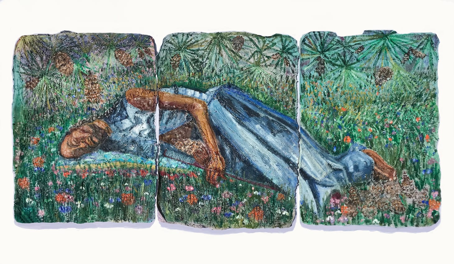 With their lushly patterned and vibrant frescoes, Jarrett Key aims to challenge perceptions of what Black leisure can look like. Raised in rural Alabama, their series Leaving the City grew out of a few experiments they conducted with visitors to their studio. “I ask them to close their eyes and imagine a Black person in an environment. They — predominantly white artists, curators, and educators — imagine Black bodies in urban spaces, landscapes defined by cement,” Key explains in a statement on the RISD website. Their resulting works feature friends and others they know, such as their friend Dee Walls in “Warrior at Rest,” in pastoral landscapes “literally held by a substrate of cement.”
