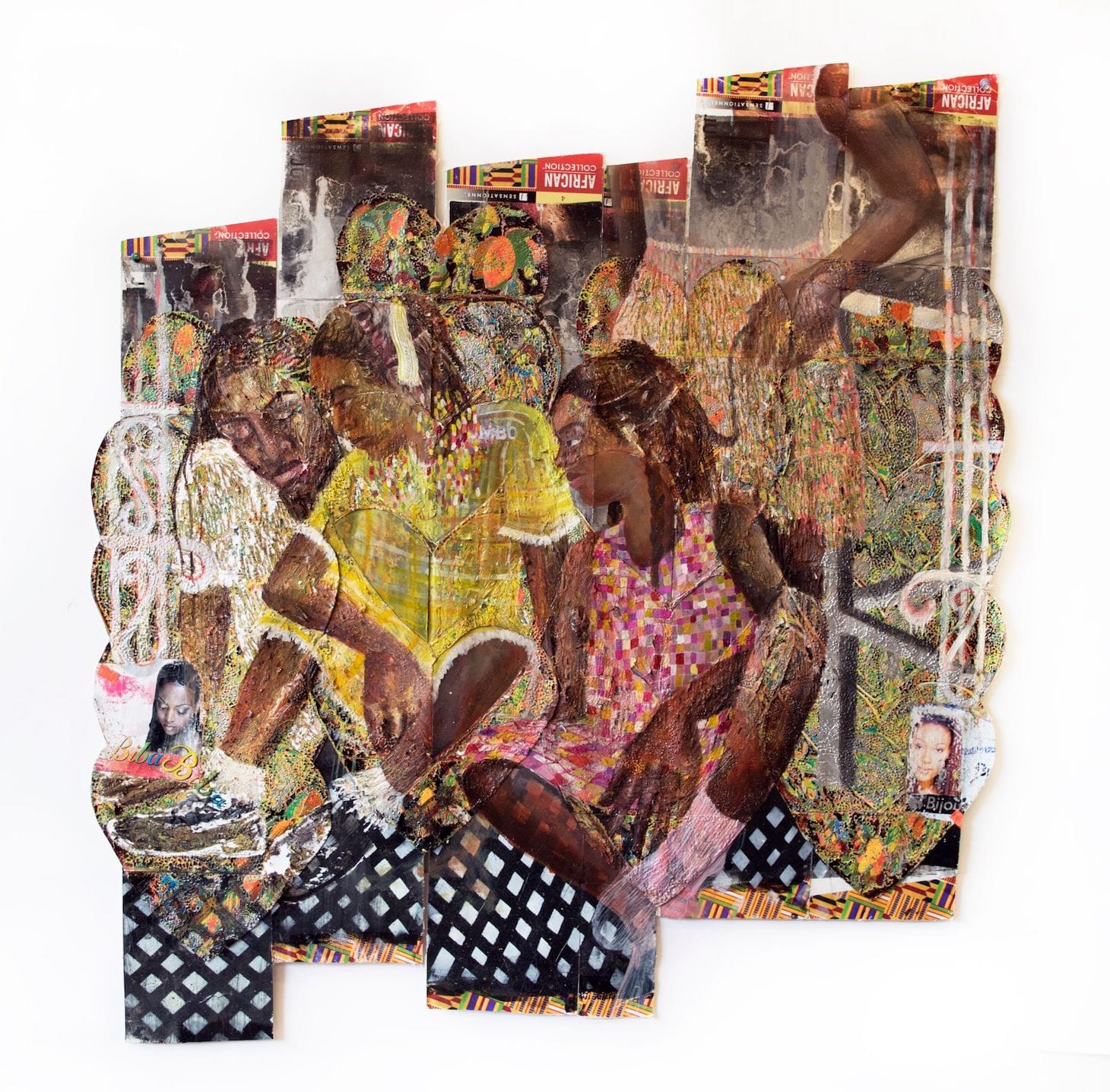 Raised in a Caribbean community in South Florida, Kathia St. Hilaire uses her intricate canvases to intertwine references to Haitian Vodun, traditional weaving techniques, and consumerism. Materials such as cast-off advertisements, bits of aluminum, and oil paint might come together to render scenes inspired by her own relationship to the Haitian diaspora, such as in “A spirit watches over you” (2020), while a closer look reveals numerous richly layered pockets of abstraction.