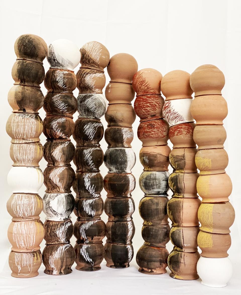 “The farther I am from my roots, the more I want to strengthen my connection to India,” writes Kopal Seth in her artist statement. Lately, her ceramics practice has drawn inspiration from various Indian terracotta traditions, with her research currently focusing on “matka” pots. Though now falling out of use, these earthen storage containers were once commonly employed to keep contents cool in the heat. “I used this forgotten vessel as a canvas to project my observations gleaned from a fast and changing world,” Seth explained over email. Patches of black, red, white, and yellow chalk adorn the surface of her work “Cause to Continue” (2020), demarcating shadows and the waning glints of light cast on roadside stacks of these pots, once a common sight around her hometown of Khurai.